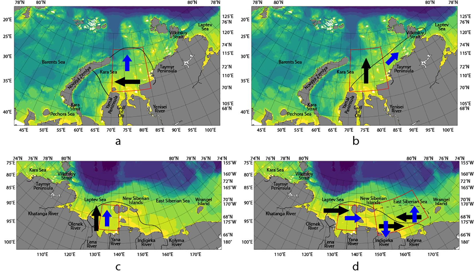 Figure 15. Scheme of the Ob–Yenisei plume spreading under wind forcing in the Kara Sea for the northwestern (a) and eastern (b) spreading types. Scheme of the Lena plume spreading under wind forcing in the Eastern Arctic for the western (c) and eastern or central (d) spreading types. Black arrows show wind direction, blue arrows indicate the Ekman drift direction of the surface layer. Black lines schematically indicate the plume boundaries. Red rectangles indicate areas of wind averaging.
