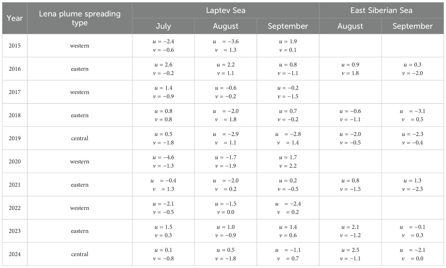 Table 1. Wind speed over the Laptev Sea in July–September (for all spreading types of the Lena plume) and over the East Siberian Sea in August–September (for eastern and central spreading types of the Lena plume) in 2015–2024.
