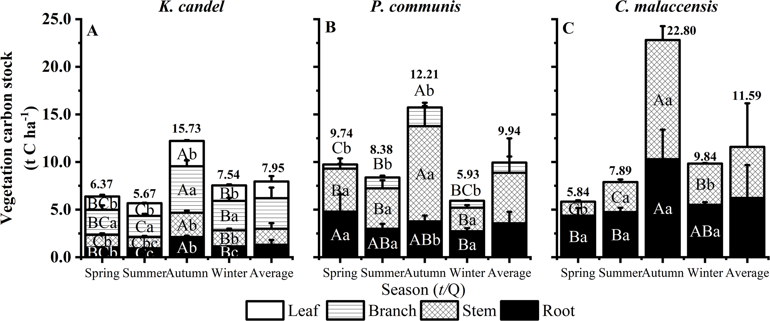 Responses of vegetation organs to seasonal dynamics of K. candel, P. australis and C. malaccensis in wetland of Minjiang Estuary. (A–C) show the sum vegetation carbon stock of different plant organs. Bars indicate mean values and error bars represent standard deviation (n = 3). Different capital letters indicate significant differences among different seasons in the same organ, and different lowercase letters indicate significant differences in different organs in the same season (P < 0.05).