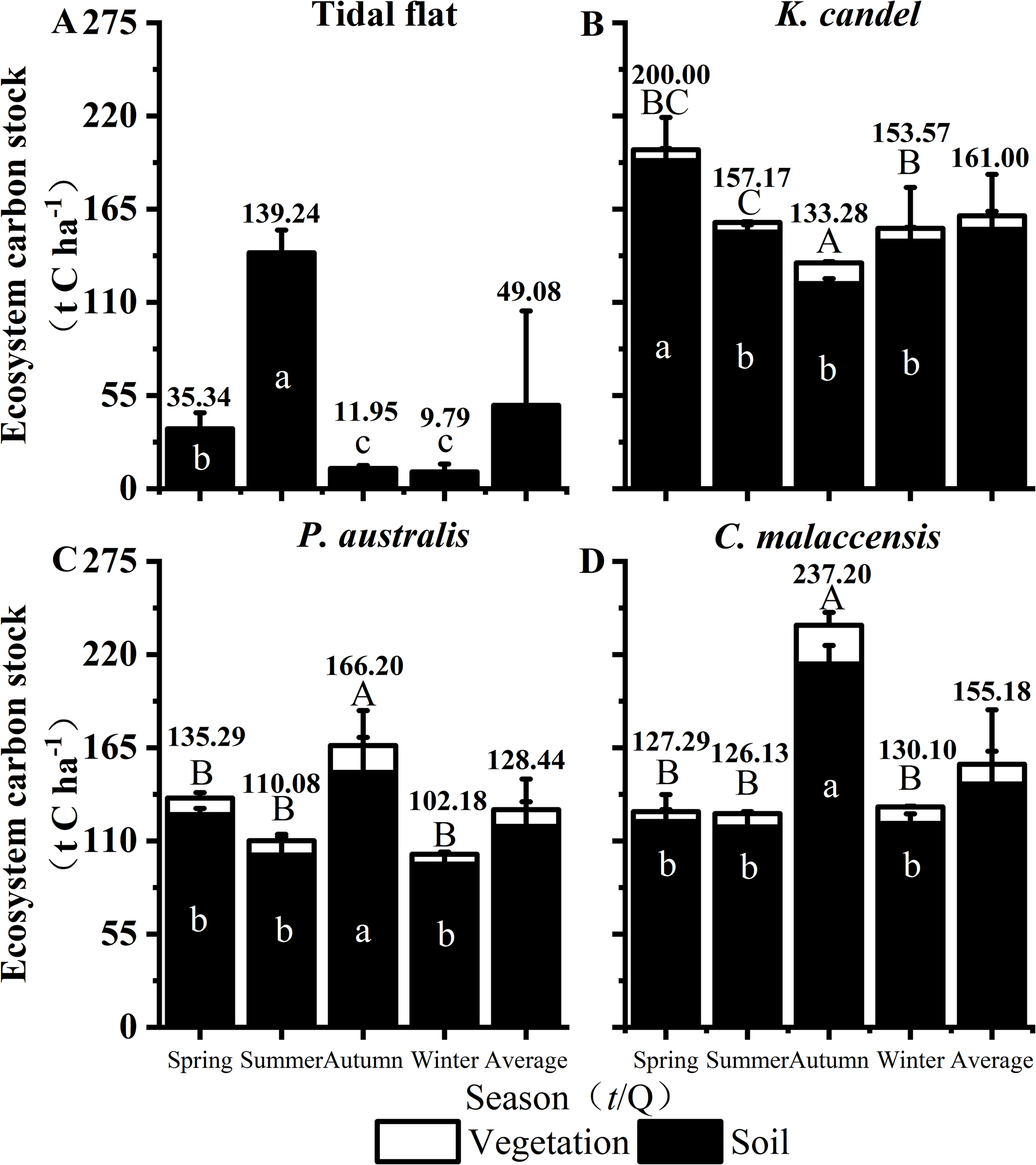 To address this knowledge gap, the present study investigates the seasonal and spatial variations in carbon stocks across three representative vegetation types in the Minjiang Estuary, including K.candel, P. australis, and C. malaccensis, with the Tidal flats included as a non-vegetated control. We proposed three hypotheses: (i)The carbon stock of the vegetation layer is expected to exhibit seasonal variation among different wetland vegetation types, driven by differences in growth cycles and the allocation of carbon among plant organs, with a peak generally occurring in autumn; (ii) The soil carbon stock is hypothesized to show seasonal variation related to the physicochemical properties and vertical heterogeneity of soils across wetland types, while being further influenced by vegetation-derived biomass inputs that typically result in higher soil carbon stocks in autumn; (iii) Wetland ecosystems with vegetation cover are expected to have higher total carbon stocks than unvegetated Tidal flats, and the timing of peak carbon stocks may varies among vegetation types. These findings aim to reveal the temporal and spatial characteristics of ecosystem-level carbon stocks among vegetation-specific estuarine wetlands, providing a scientific foundation for coastal wetland protection and carbon sequestration management strategies in China’s coastal regions.