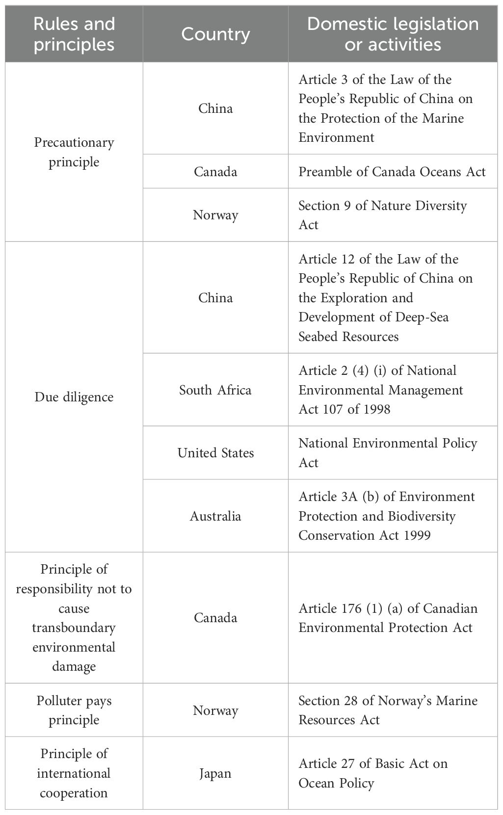 The principle of due diligence requires States and relevant responsible entities to take all reasonable measures within their jurisdiction to ensure that activities under their control do not cause undue harm to the environment. This principle has been increasingly reflected in national legislation. For instance, Article 12 of China’s Law on the Exploration and Development of Deep-Sea Seabed Resources mandates that contractors must employ advanced technological methods to prevent or mitigate environmental damage to the marine ecosystem (Ministry of Ecology and Environment of the People’s Republic of China, 2016b). Similarly, Section 2(4)(i) of South Africa’s National Environmental Management Act stipulates that environmental decision-making must include a comprehensive assessment of social, economic, and environmental impacts to ensure the sustainability of development initiatives (South Africa Government, 1998). This principle highlights the importance of proactive risk identification and management in environmental governance.