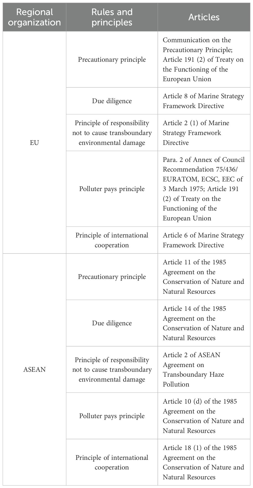 The European Union (EU) and the Association of Southeast Asian Nations (ASEAN) are representative regional organizations in the fields of regional integration and multilateral cooperation, serving as benchmarks for the two major blocs, the West and the Global South. They incorporate and integrate the rules and principles of general international law into their relevant legal and policy documents to achieve the objectives of marine environmental protection and conservation within their respective regions (See Table 2).