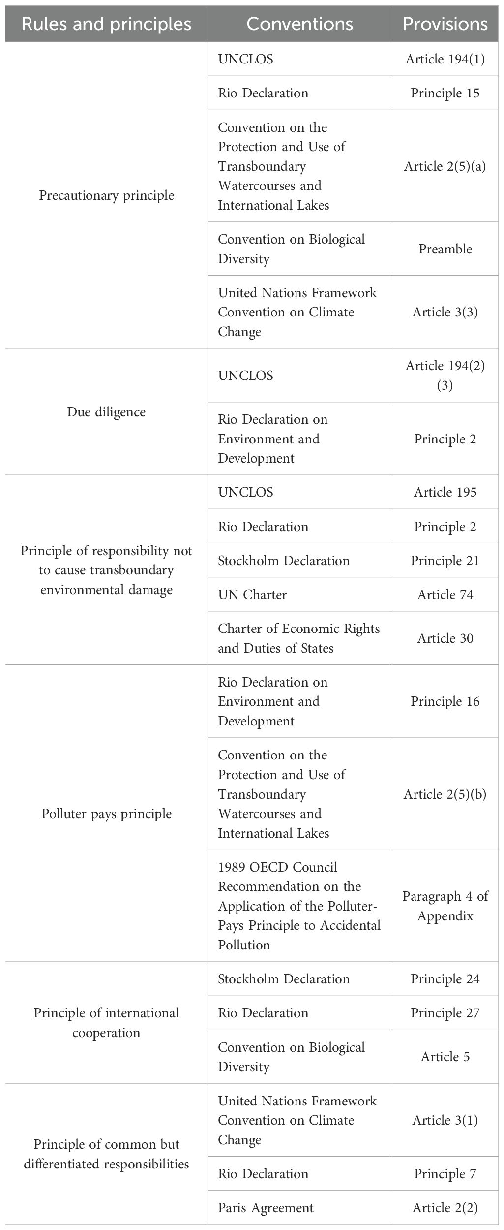 At the international level, rules and principles of general international law concerning marine environmental protection and conservation are embedded in numerous treaties and declarations (see Table 3).