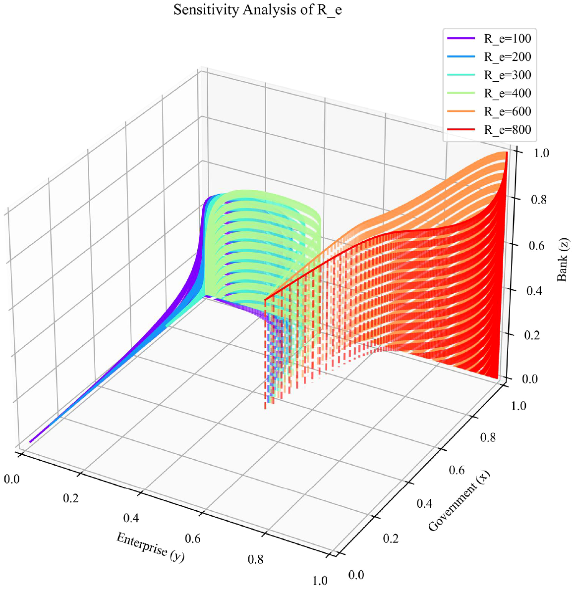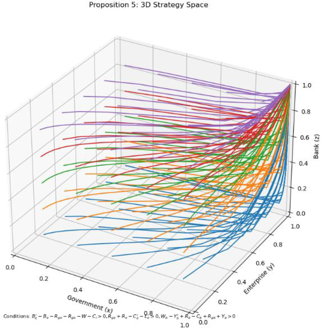 Based on the expected payoffs and replicator dynamics equations, the stability of the tripartite game model can be analyzed. By solving the system of replicator dynamics equations: