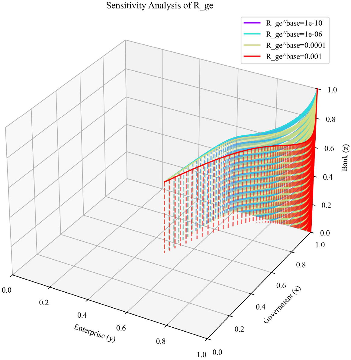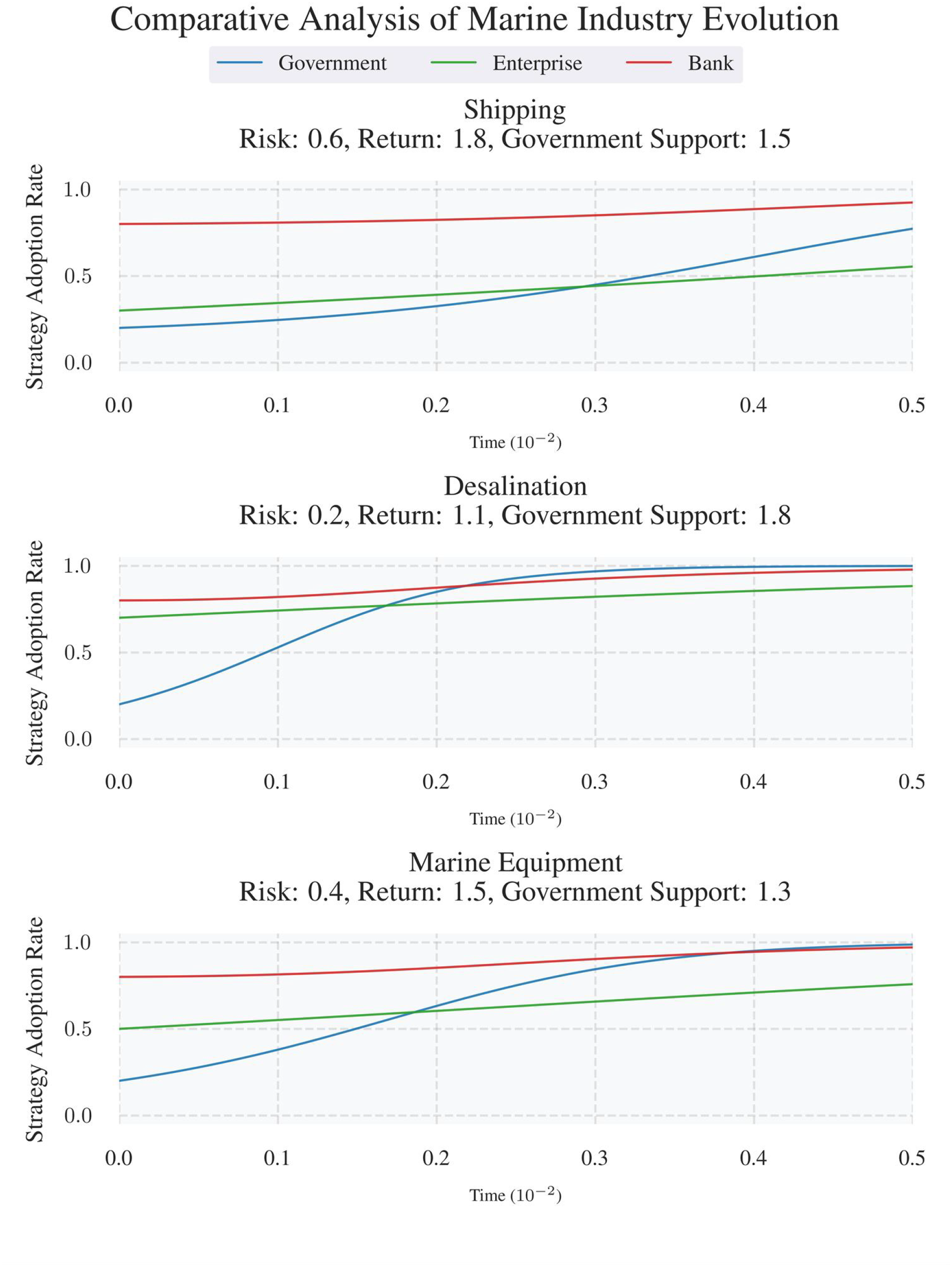 As we know, three players-government, bank and marine enterprises have their own tradeoffs. Governments are pivotal in steering ocean economic development (Xu et al., 2025b). Through measures including policy guidance, market-based incentives, and risk compensation, they effectively intervene in the behaviors of banks and enterprises, optimize resource allocation, and enhance industrial competitiveness (Sumaila et al., 2021). However, designing balanced policies to optimize tripartite collaboration among governments, banks, and enterprises remains complex, particularly given the need for scientific and flexible regulatory frameworks to enhance financial efficiency and effectiveness in ocean sectors.