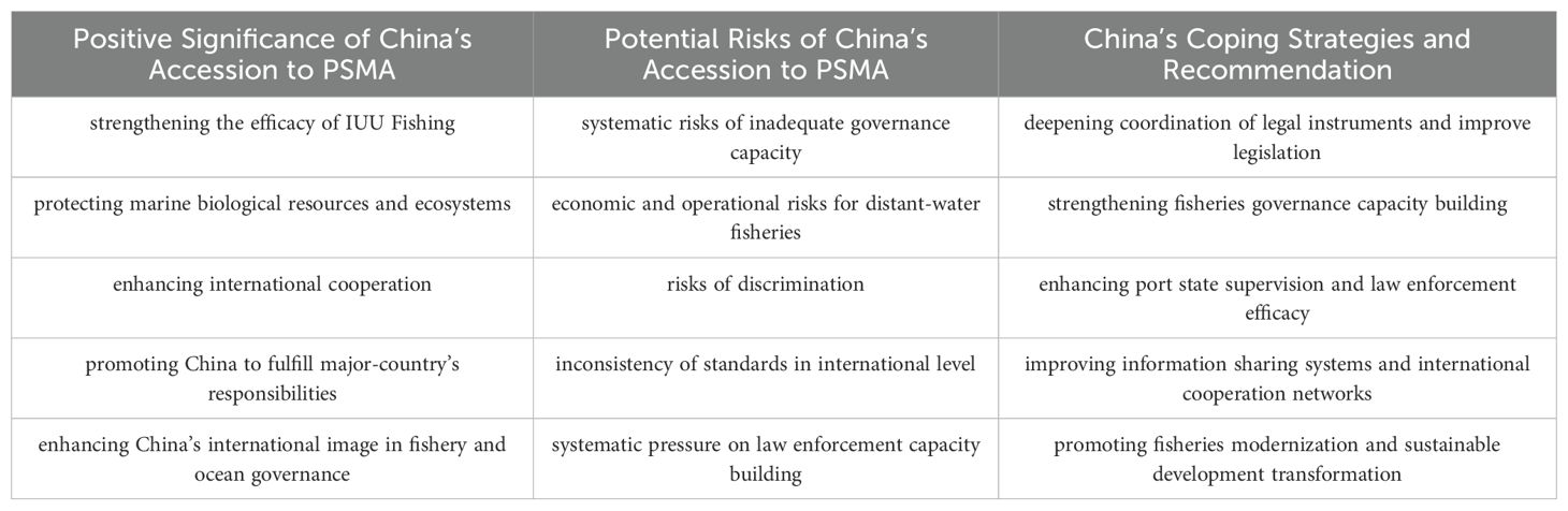 From a global governance perspective, as one of the world’s largest producers, processors, and importers/exporters of fisheries products, China’s accession to the PSMA significantly expands the Agreement’s application and coverage (Eco-Business, 2025). China has numerous coastal ports, with over 99% of vessels calling at these ports being domestic. This means that after PSMA’s implementation, China’s domestic fleets will face stricter inspections upon returning to ports, a mechanism that exerts a significant impact on global efforts to combat IUU fishing (Eco-Business, 2025). By preventing illegal catches from landing and circulating through Chinese ports, it not only ensures the long-term conservation and sustainable use of marine biological resources (National Business Daily Online, 2025) but also plays a vital role in safeguarding food security, promoting stable development of fisheries trade, and ensuring supply chain security, providing solid support for healthy growth of domestic and international marine economies and the well-being of coastal communities. Furthermore, China’s accession is meaningful to govern illegal fishing activities in neighboring waters, promoting regional marine ecological protection cooperation while safeguarding its maritime rights under the UNCLOS (Constantino et al., 2022).