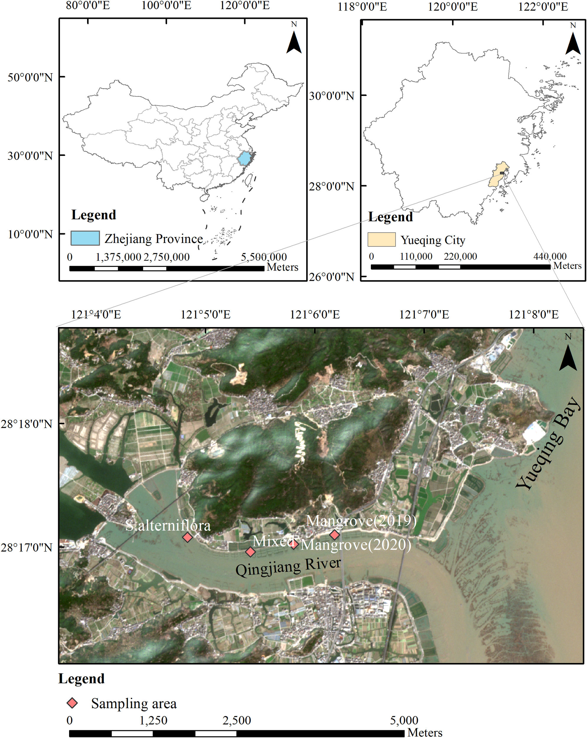 Geographical overview of the Qingjiang River Estuary, Zhejiang Province, China. The upper left panel shows the location of Zhejiang Province within China, the upper right panel shows Yueqing City within Zhejiang Province, and the main panel displays a high-resolution satellite image of the study area. Red diamonds indicate sampling points for physical and chemical indicators across four vegetation zones: S.alterniflora, Mixed areas, Mangrove (2020), and Mangrove (2019). Scale bars are provided for each map level.