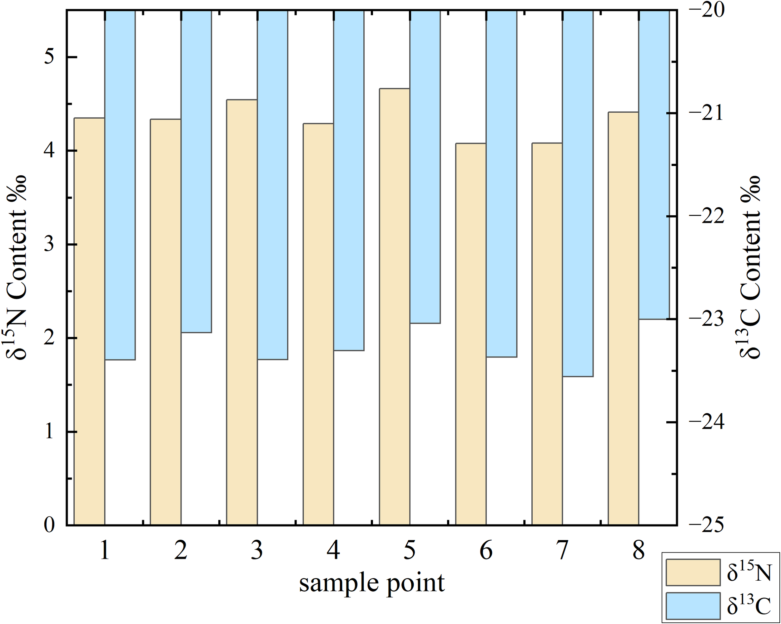 Distribution of δ¹³C and δ¹5N in Qingjiang estuary samples. Bar chart showing isotopic signatures at eight sampling points across the study area: Spartina alterniflora zone (points 1-2), mixed zone (points 3-4), mangrove zone planted in 2020 (points 5-6), and mangrove zone planted in 2019 (points 7-8). Yellow bars represent δ¹5N values (left y-axis), and blue bars represent δ¹³C values (right y-axis). The variation in isotopic composition reflects different organic matter sources and biogeochemical processes across the sampling locations.
