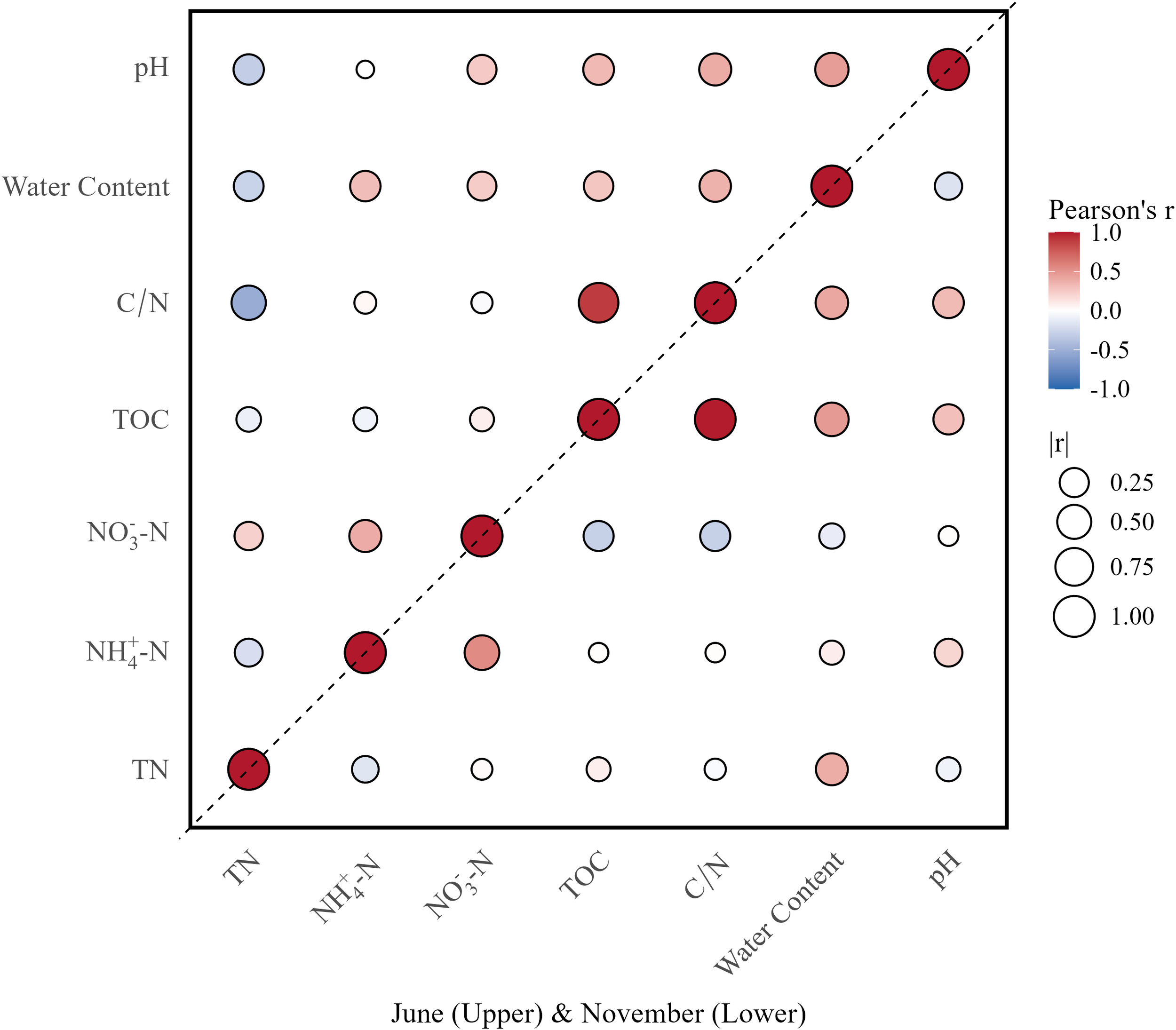 Half-matrix double season correlation plot showing autumn-summer seasonal relationships between environmental variables. The upper triangle represents June data and the lower triangle represents November data. Circle size indicates correlation strength (|r|), and color represents correlation direction (red for positive, blue for negative). Variables include total nitrogen (TN), ammonium (NH4-N), nitrate (NO3-N), total organic carbon (TOC), carbon-nitrogen ratio (C/N), water content, and pH.