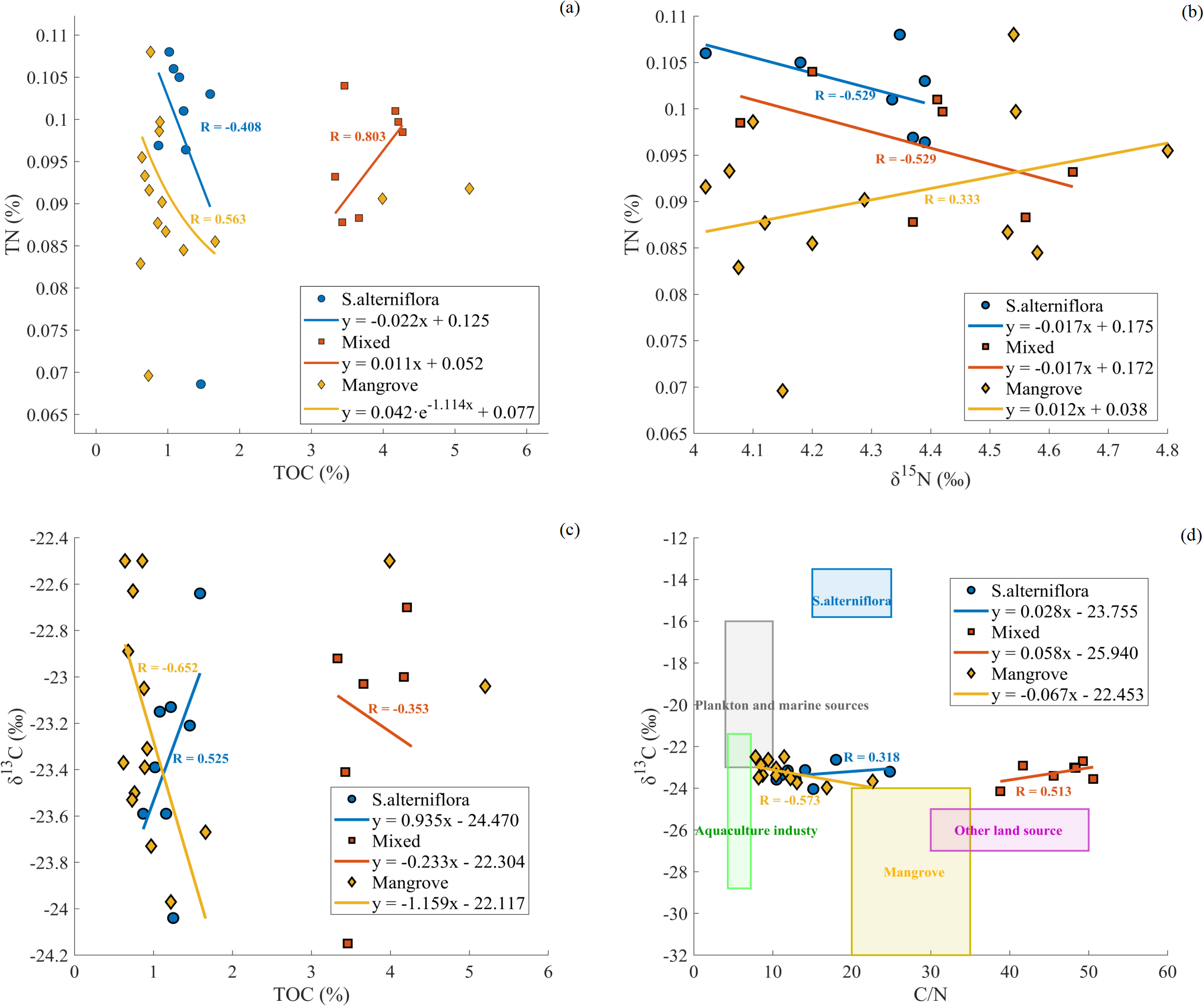 Correlation analysis of TN, TOC, δ¹³C, δ¹5N and C/N at the Qingjiang River Estuary. (A) TN vs TOC, (B) TN vs δ¹5N, (C) δ¹³C vs TOC, (D) δ¹³C vs C/N. Different symbols represent different vegetation areas: circles for S.alterniflora, squares for Mixed areas, and diamonds for Mangrove areas. Solid lines represent significant correlations (p < 0.05). The colored boxes in panel (D) indicate different organic matter sources.