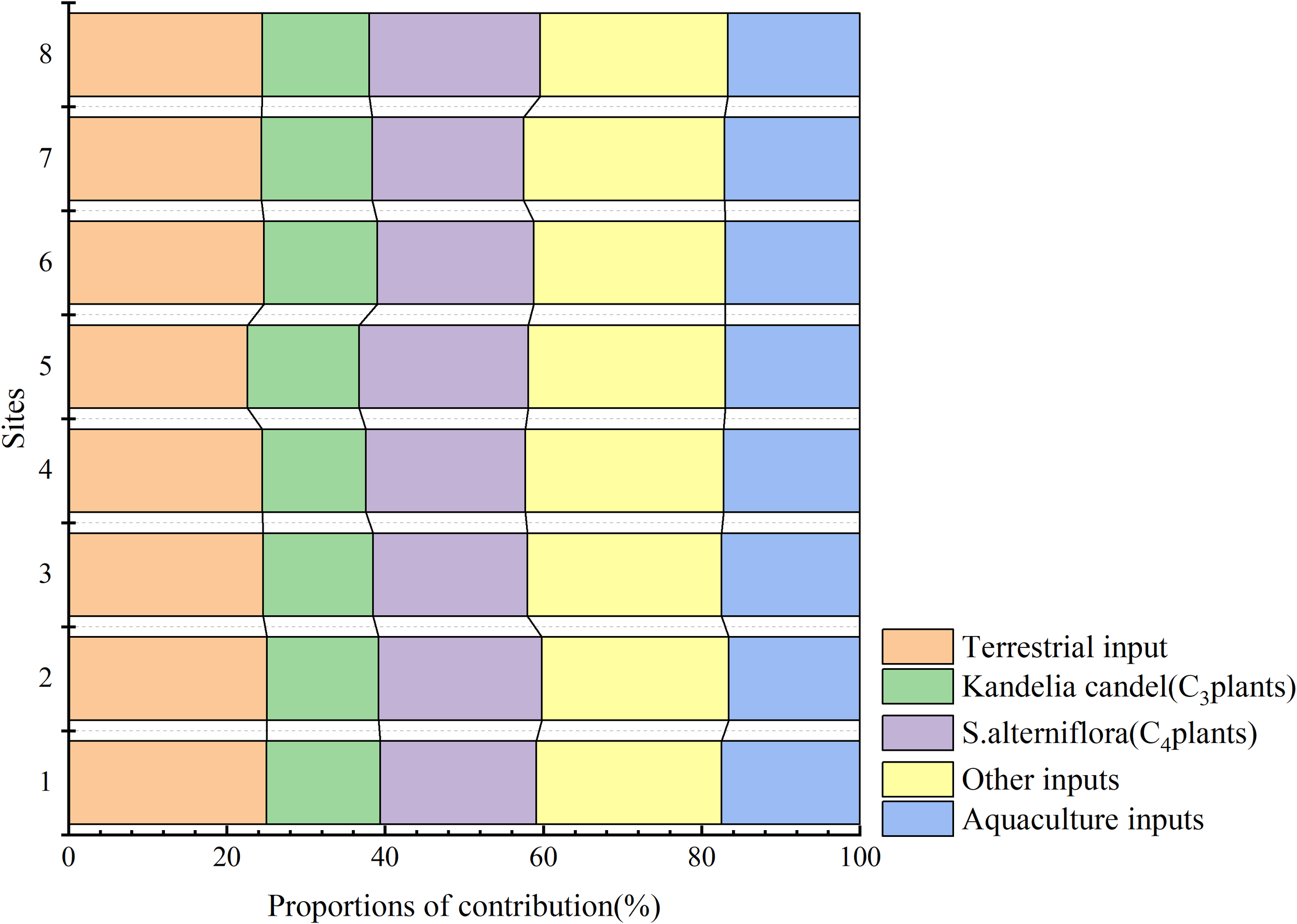 The results indicated that Kandelia candel (C3 plants) contributed 22.8% to 25.3%, S.alterniflora (C4 plants) contributed 22.5% to 25.8%, Plankton and marine sources contributed 10.2% to 11.8%, the Aquaculture industry contributed 15.9% to 17.6%, and Other Land Sources contributed 24.1% to 25.2%. The δ¹³C and δ¹5N values of each sediment sample exhibited minimal fluctuations, and the contribution rates of organic matter from each source remained relatively constant, as depicted in Figure 7. The average contribution rates of each organic matter source revealed that Other Land Sources (24.6%) >were the greatest, followed by Kandelia candel (C3 plants) (23.83%), S.alterniflora (C4 plants) (23.75%), the Aquaculture industry (16.7%), >and Plankton and marine sources (11.12%). These findings elucidated the multi-source characteristics of sediment organic matter in the mangrove area. The sediment organic matter in the mangrove forest area of the Qingjiang Estuary predominantly originates from terrestrial plants (encompassing C3 and C4 plants) and other terrestrial sources.