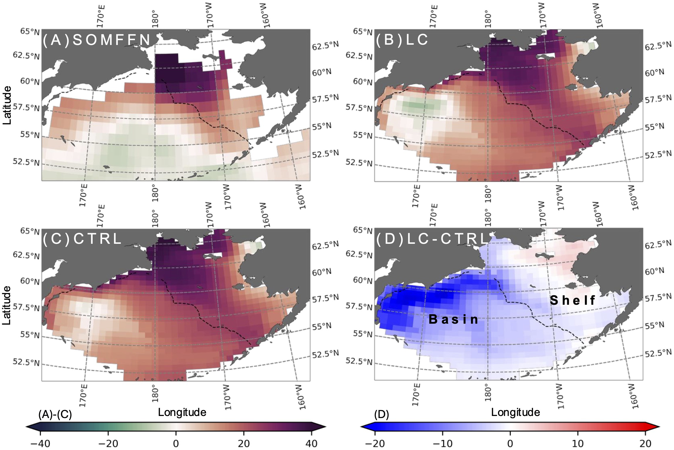 Annual mean for (A) SOMFFN, (B) LC, (C) CTRL and (D) LC minus CTRL. The black dashed line denotes the 200 m isobath.