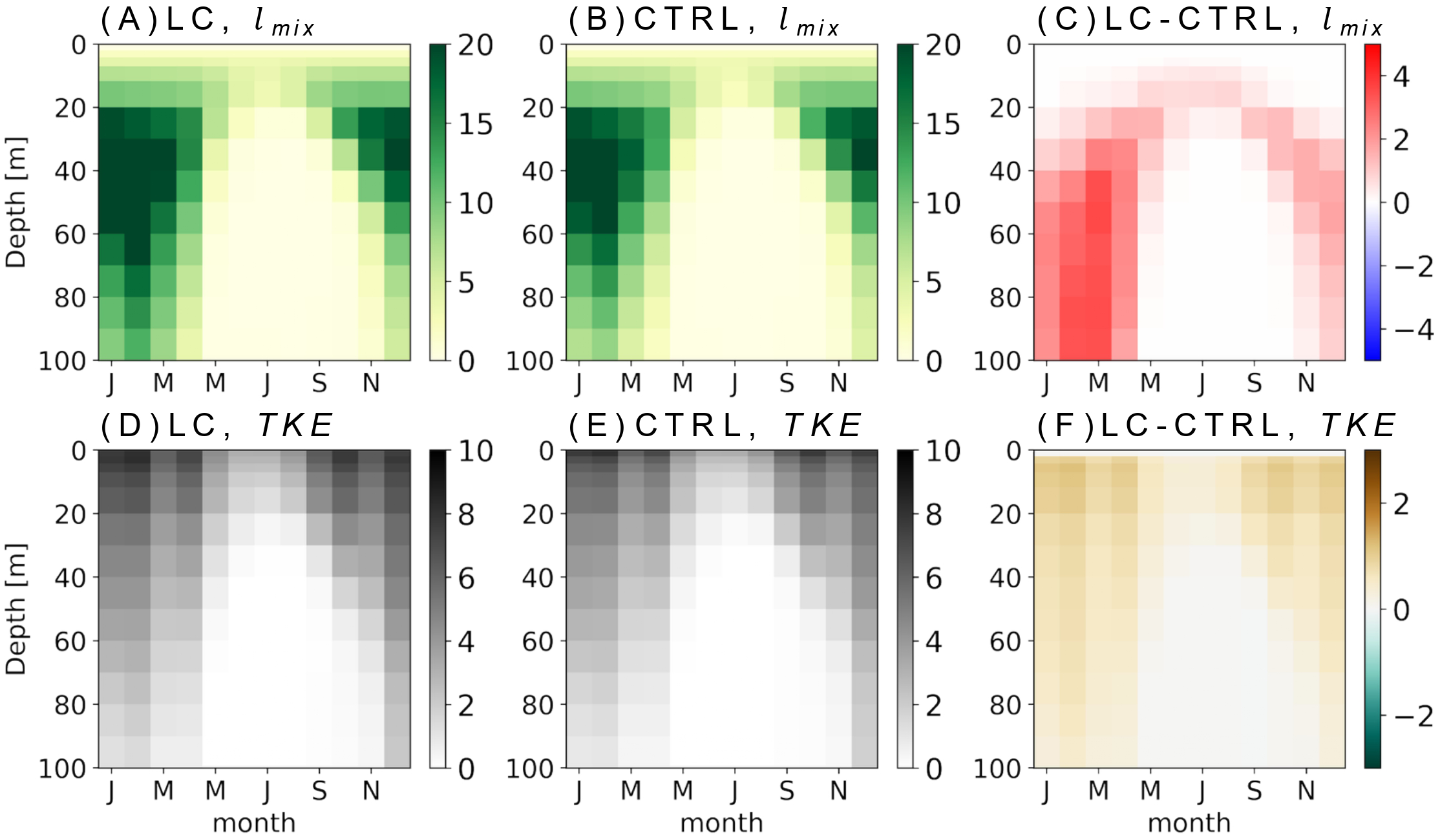This improvement can be attributed to enhanced vertical mixing by the LC effect. Compared with the MLD climatology dataset v2023 (de Boyer Montégut et al., 2004; de Boyer Montégut, 2023), CTRL has a shallower MLD bias in the basin, which is mitigated in the LC simulation (Supplementary Figure S1). This deepening results from increased turbulent mixing due to the inclusion of the LC effect. The LC parameterization is expected to enhance the lmix near the surface under weakly stratified conditions (Noh et al., 2016). Indeed, lmix is significantly amplified in the LC simulation, particularly during winter and early spring, showing an increase of approximately 44% near 100 m compared to CTRL (Figure 2C). Consistent with this, the increase in TKE is also more pronounced during winter and early spring, extending beyond 100 m (Figure 2F), suggesting deeper and more sustained vertical mixing due to LC.
