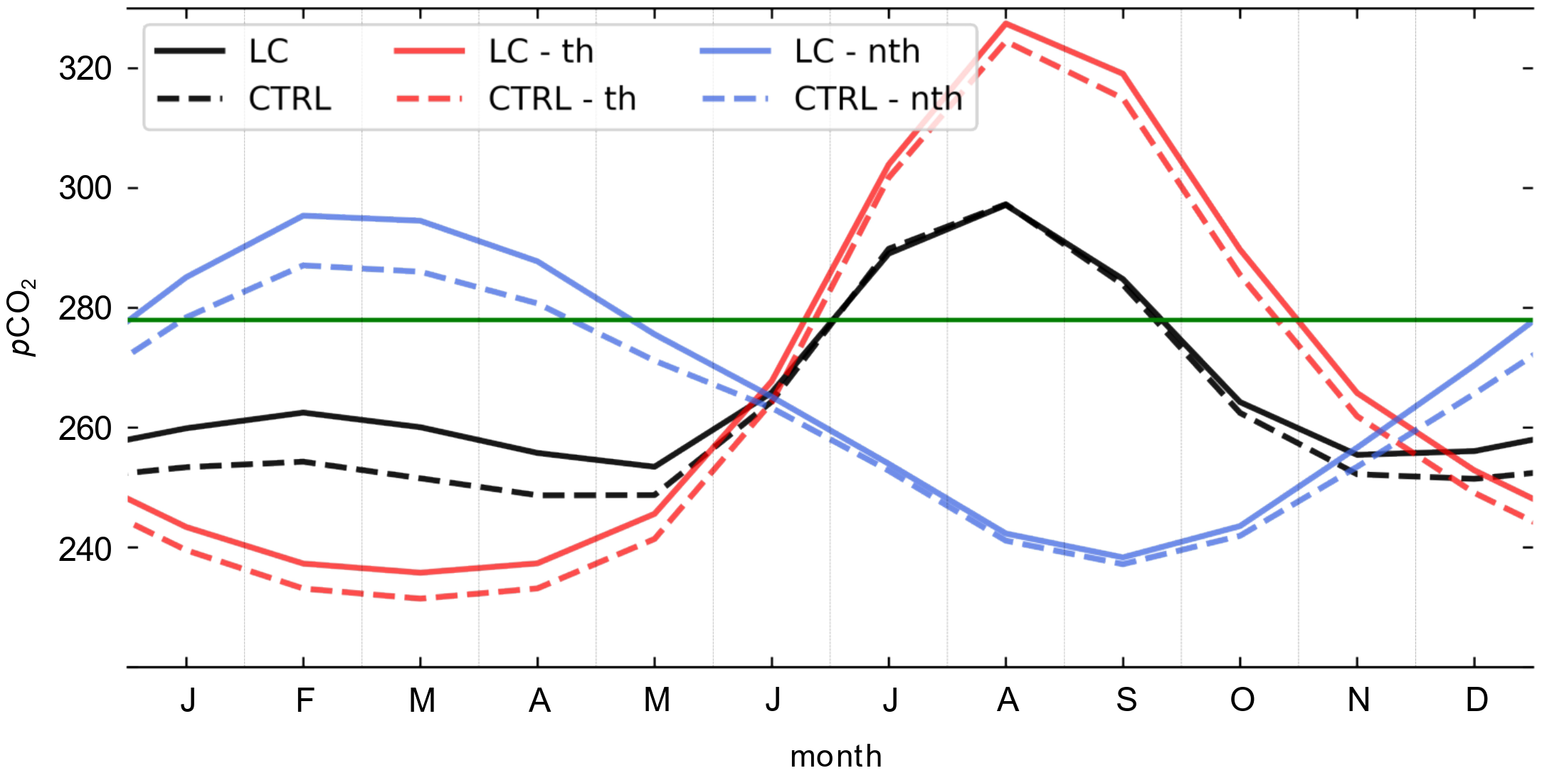 Focusing on the differences between the two experiments, the LC effect increases pCO2 and both of its components ( and ) during winter. In March, increases by 4.3 µatm due to the LC effect, which corresponds to approximately 13% of the seasonal standard deviation in CTRL . The LC effects on are minimal during summer, and this is consistent with the limited changes in vertical mixing, as indicated by little change in TKE and lmix (Figure 2). Overall, the LC effect slightly reduces the seasonal amplitude of by about 1% compared to CTRL, indicating that the thermal contribution is small.
