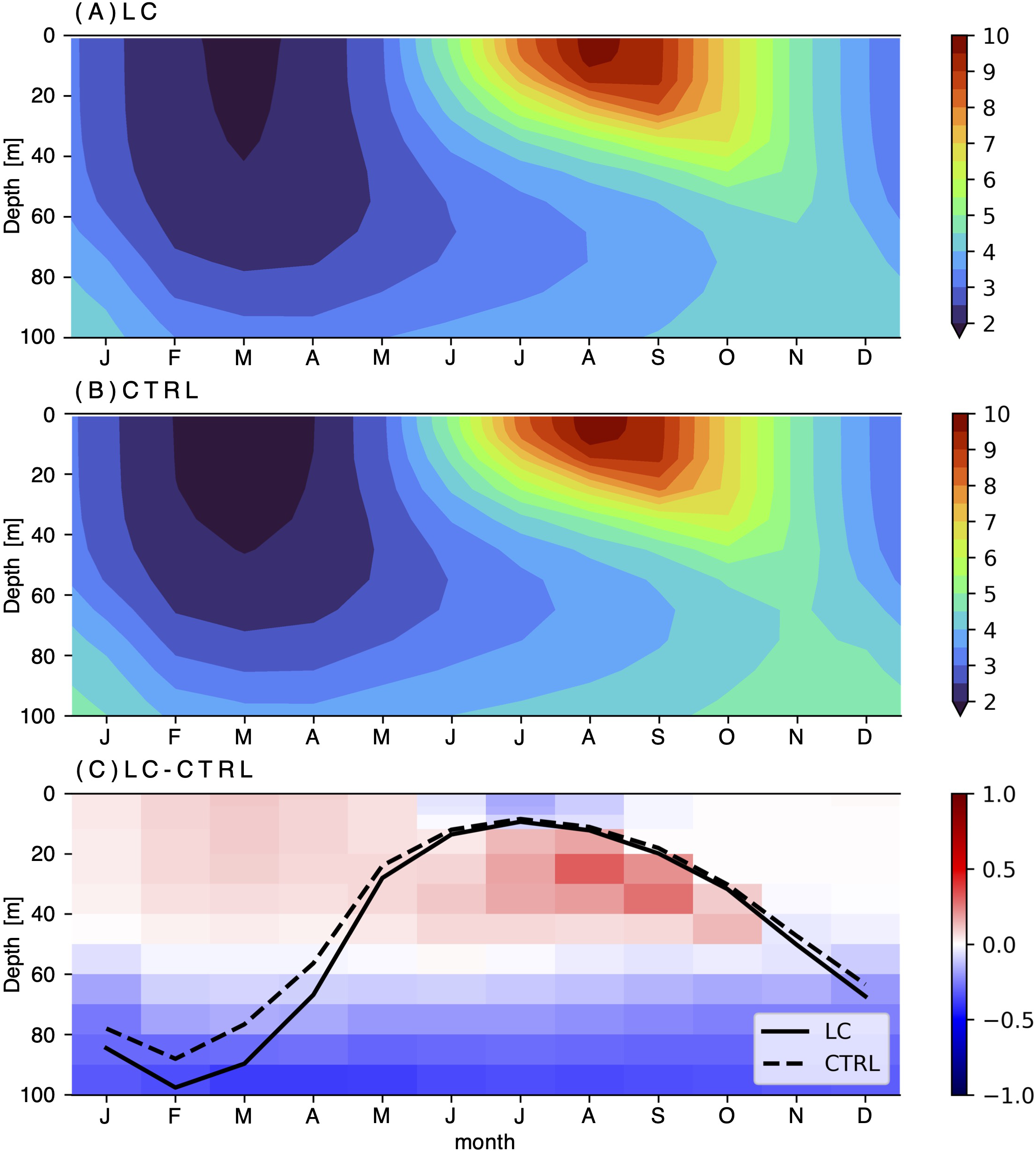 Seasonal cycle of vertical potential temperature (°C) profile for (A) LC, (B) CTRL and (C) LC minus CTRL in the Bering Sea basin. The black solid (dashed) line denotes the MLD of LC (CTRL).