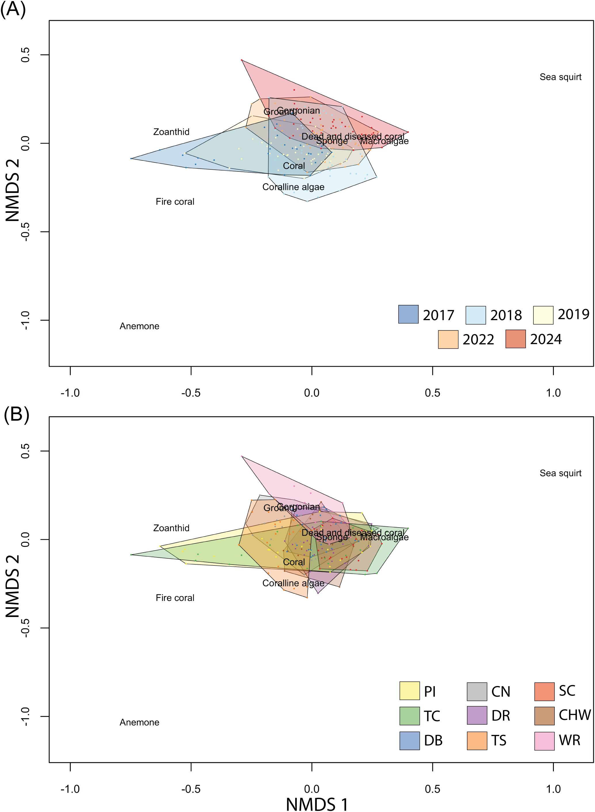 Figure 2. Non-metric multidimensional scaling (NMDS) ordination of reef benthic community composition based on Bray–Curtis dissimilarities of species abundance data. Each point represents a single 30 m transect survey (n = 5 per site per year, except where noted), with spatial proximity in the ordination space reflecting similarity in species composition. Species groupings are overlaid to indicate the relative position of different taxa within the multivariate space. In (A), points are colored by year, illustrating temporal shifts in community structure. In (B), points are colored by site (Figure 1), showing spatial variation in assemblage composition. The NMDS was conducted in four dimensions and yielded a stress value of 0.082, mean R² = 0.005; Spearman ρ = 0.975 indicating a good representation of the original dissimilarities. See Supplementary Files for plots disaggregated by site and year.