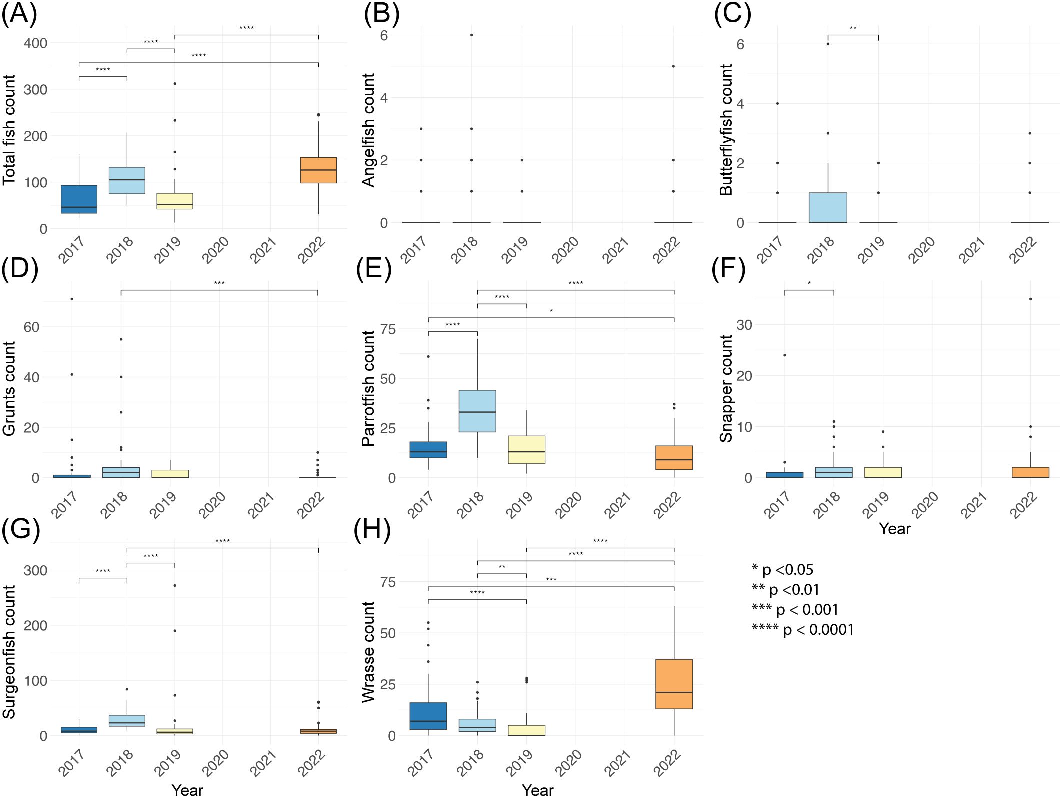 Figure 4. Boxplots of fish average density (#/100 m2) across survey years in the East Portland Special Fishery Conservation Area, Jamaica. Panels show average density (#/100 m2) of (A) total fish, (B) angelfish, (C) butterflyfish, (D) grunt, (E) parrotfish, (F) snapper, (G) surgeonfish, and (H) wrasse. Each box summarizes transect-level data from all monitored sites (missing data provided in Table 1). Boxes represent the interquartile range (25th–75th percentile), horizontal lines indicate medians, and whiskers denote 1.5 × the IQR. Significant differences between year, as determined by one-way ANOVA or Kruskal-Wallis with appropriate post hoc comparisons, are indicated with asterisks (*p < 0.05, **p < 0.01, ***p < 0.001, ****p < 0.0001).