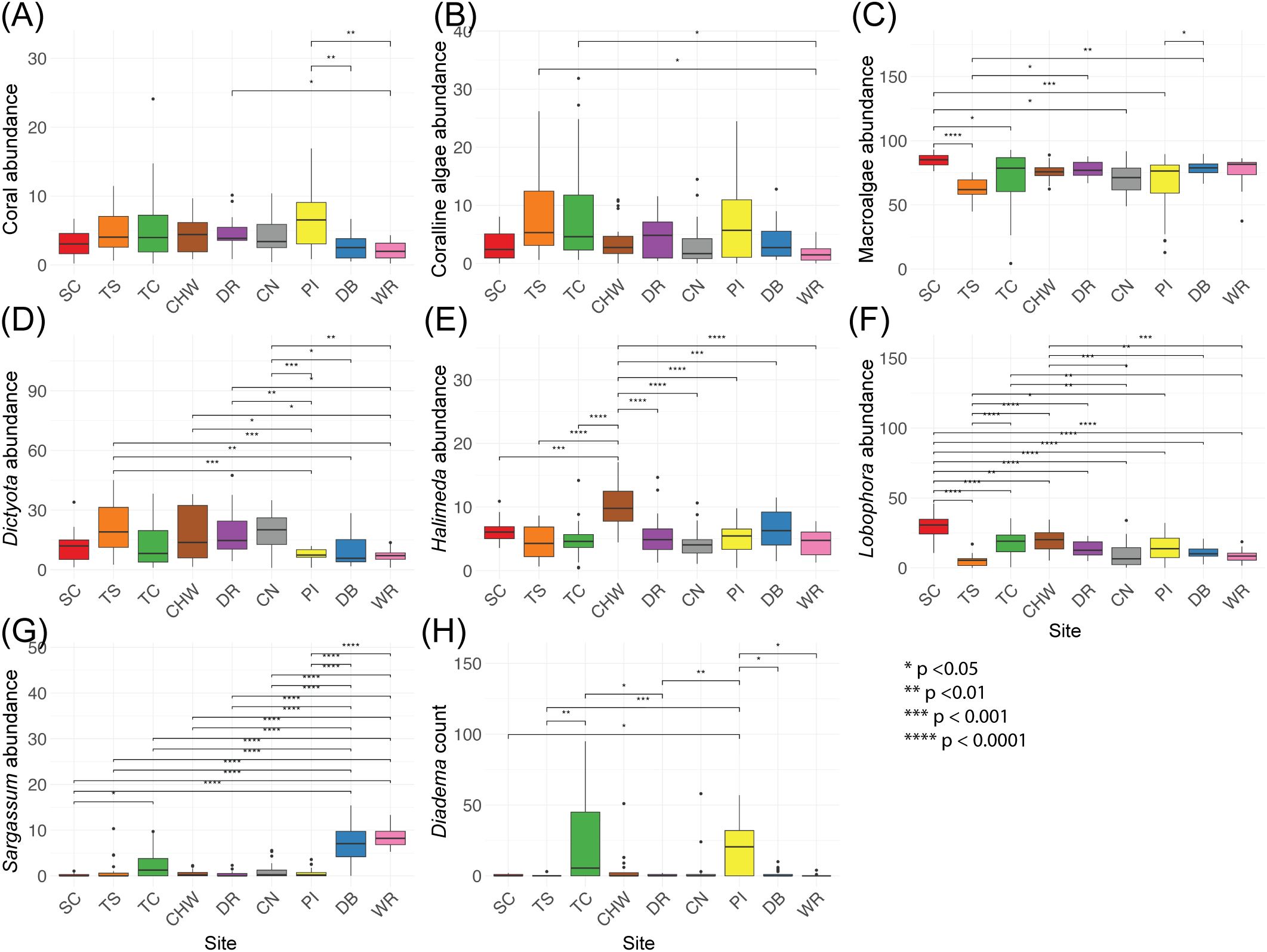 Figure 6. Boxplots of benthic community data across survey sites in the East Portland Special Fishery Conservation Area, Jamaica. Panels show percent abundance of (A) coral, (B) coralline algae, (C) macroalgae, (D) Dictyota, (E) Halimeda, (F) Lobophora, (G) Sargassum, and (H) D. antillarum density (individuals per 180 m², the 30 m × 6 m survey belt). Each box summarizes transect-level data from all monitored years (missing data provided in Table 1). Boxes represent the interquartile range (25th–75th percentile), horizontal lines indicate medians, and whiskers denote 1.5 × the IQR. Significant differences between sites, as determined by one-way ANOVA or Kruskal-Wallis and appropriate post hoc tests, are indicated with asterisks (*p < 0.05, **p < 0.01, ***p < 0.001, ****p < 0.0001).