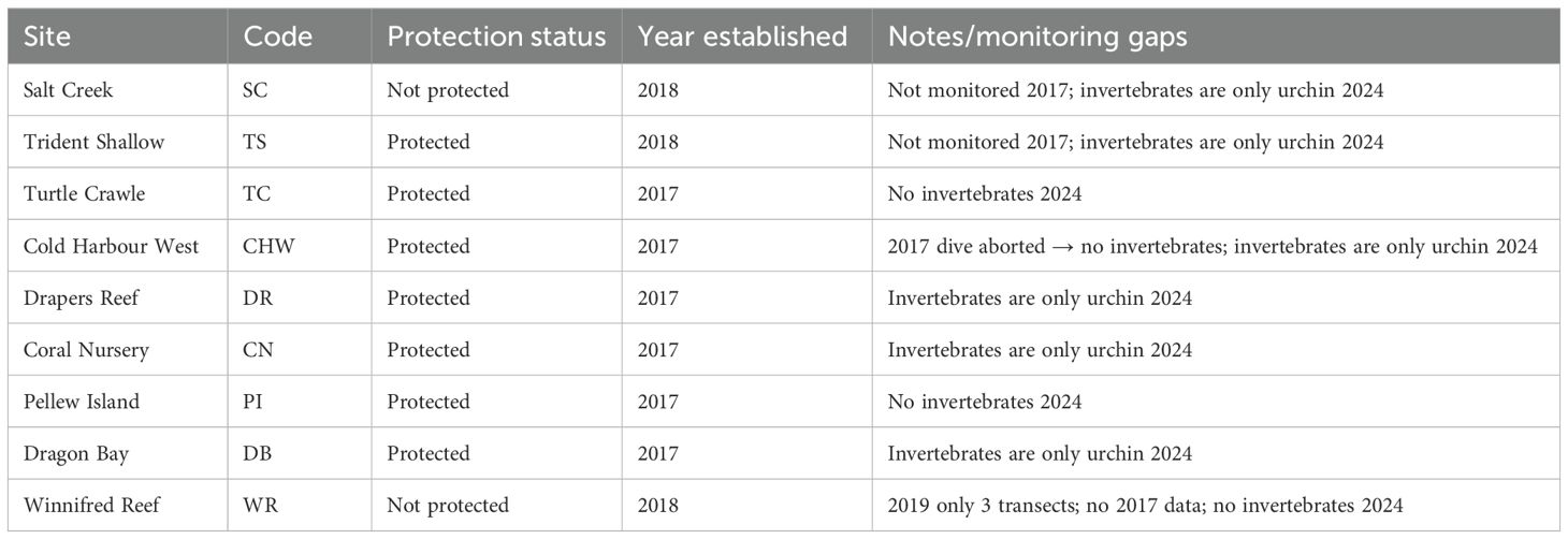 Because the goal of data collection is monitoring, the transects were conducted in roughly the same location on the reef, but there are differences in the precise start and end position from year to year. Every site consistently had five transects with few exceptions (Table 1): Cold Harbour West had a single transect and recorded no invertebrate data in 2017 (dive had to be aborted), and Winnifred Reef had only three transects in 2019 (camera malfunction). When analyses are run including invertebrates (regressions), Cold Harbour West 2017 is removed. Furthermore, Salt Creek, Winnifred Reef, and Trident Shallow were not monitored in 2017 in any capacity. Fish analyses were not run in 2024 due to a lack of personnel, and urchins (D. antillarum and other) were the only invertebrates monitored at a subset of sites (Salt Creek, Trident Shallow, Cold Harbour West, Drapers Reef, Coral Nursery, and Dragon Bay).