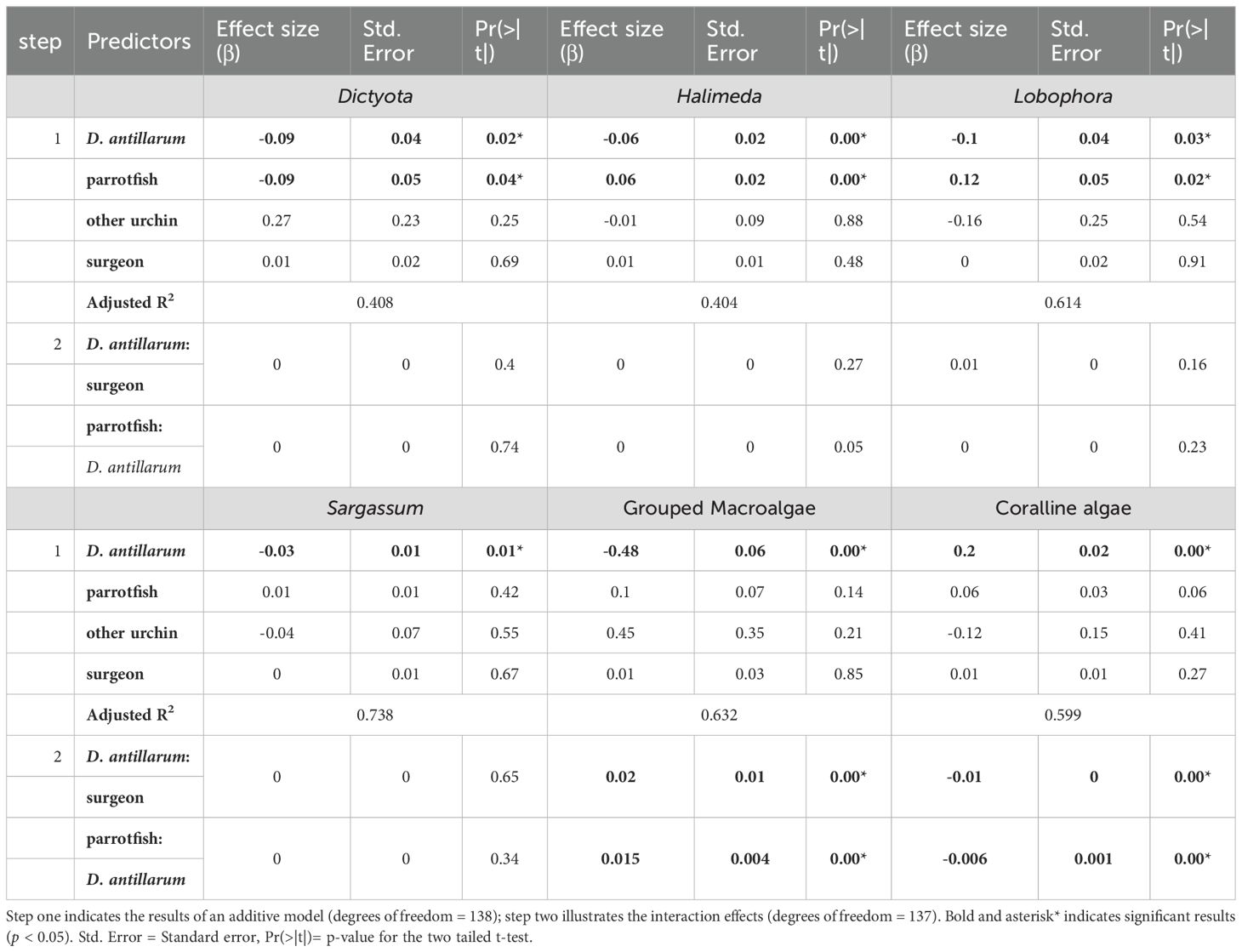 Table 2. Regression results for algae Dictyota, Halimeda, Lobophora, Sargassum, grouped macroalgae, and coralline algae with the predictors of herbivores counts of D. antillarum, parrotfish, other urchin, surgeonfish and their interactions.