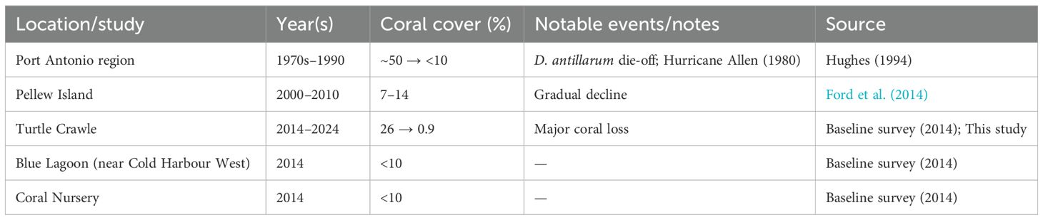 Table 3. Historical coral cover records from sites in and near the East Portland Special Fishery Conservation Area (EPSFCA), Jamaica. Values summarize previously published surveys and the present study, illustrating long-term regional coral decline and major disturbance events since the 1970s.