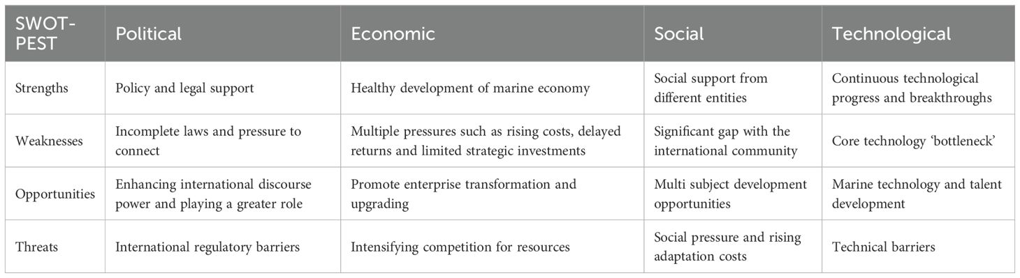This study applies the SWOT-PEST analysis to comprehensively assess and evaluate China’s position under the BBNJ EIA framework. By constructing a SWOT-PEST analytical matrix (Table 1), this study aims to explore potential strategies for China’s response to the evolving regulatory landscape.