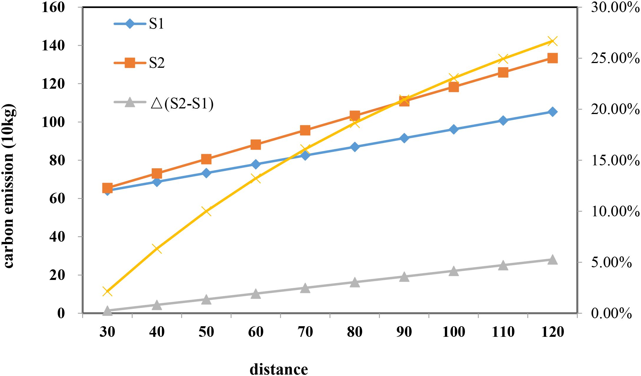 Both of the Table 3 and Figure 1 illustrate that there is a positive correlation between the distance from the shipper to the dry port and the relative reduction in carbon emissions for scenario S1 over S2. At a 30 km distance, the emission differential between S1 and S2 is a mere 2.15%, whereas at 120 km, this gap increases to 26.68%. Consequently, for distances under 20 km, direct shipment to the dry port by the shipper is the more beneficial option. Figure 2 depicts the fluctuation in carbon emission reduction for S1 compared to S2 as the distance between each shipper and the dry port expands. For shippers, carbon emission reduction translates directly into cost savings. With a carbon price of 48 RMB per ton (in line with the starting price in China’s carbon market on July 16, 2021), the cost efficiencies across transportation modes, when the distance between dry ports and seaports is constant, are detailed in Table 5. This table reflects how cost savings fluctuate with the changing distance between shippers and dry ports. These savings have tangible implications for encouraging shippers to adopt greener transportation practices.