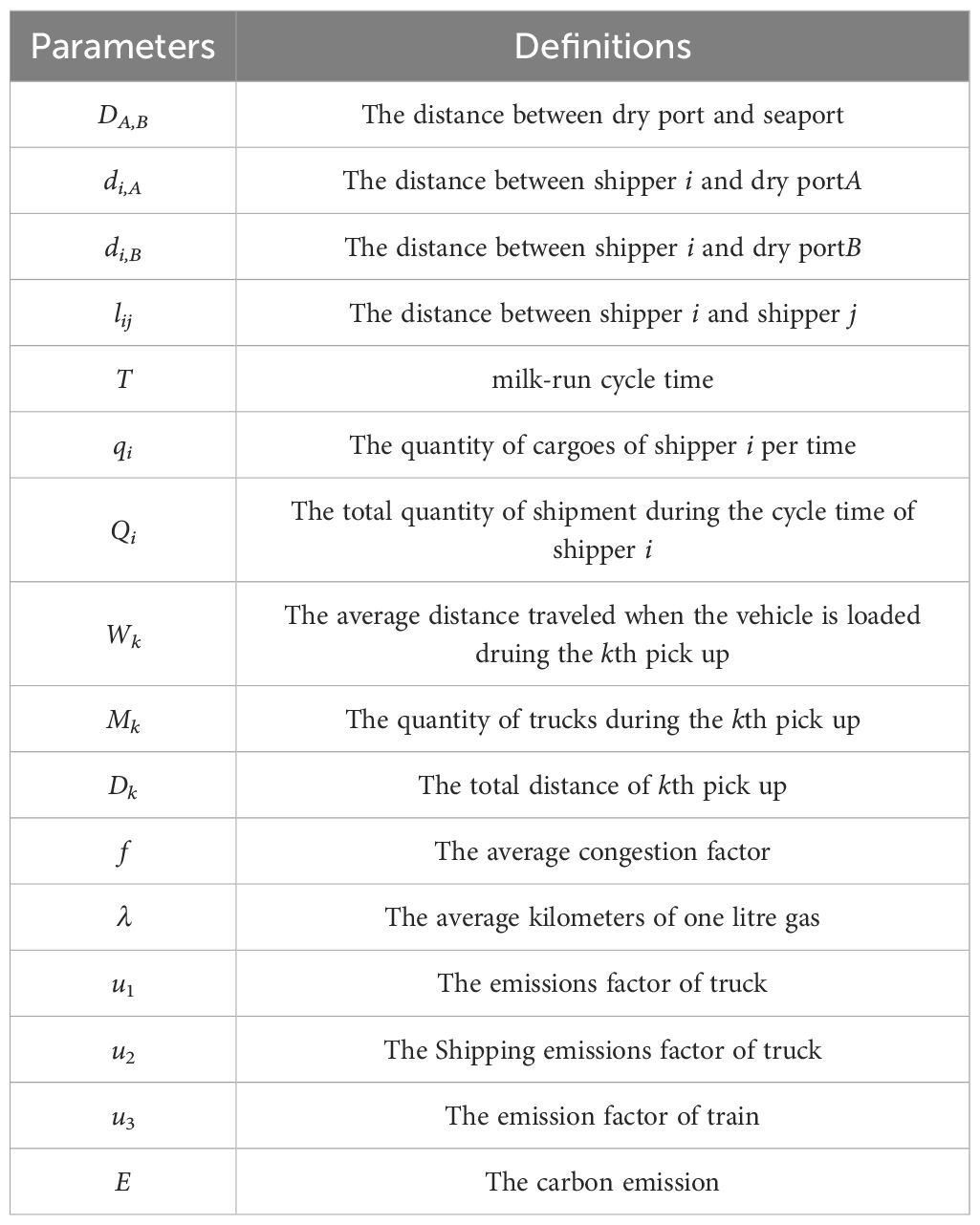 The model is grounded in a set of assumptions, which are adapted from the frameworks proposed by Kovač et al (Kovač et al., 2023),, and aligned with the Guidelines for Measuring and Managing CO2 Emission from Freight Transport Operations published by the ECTA (European Chemical Transport Association and European Chemical Industry Council, 2011). The following two prerequisites are adopted: (1) the shipper sustains a consistent production rate within the specified time period, remaining invariant throughout; (2) cargo can be efficiently transported to dry ports and storage temporarily via trucking. Given the economies of scale, the storage costs at these dry ports are notably lower than the expenses incurred by consignors utilizing their own warehouse facilities; (3) Rail transport is the modal choice for the movement of goods from dry port to seaport, whereas road transport is utilized for the delivery of shipments from shippers to dry port and seaport; (4) The milk-run route is established in advance, with the sequence of visiting shippers is determined by the pickup orders. The notations to be used are listed as shown in Table 1.