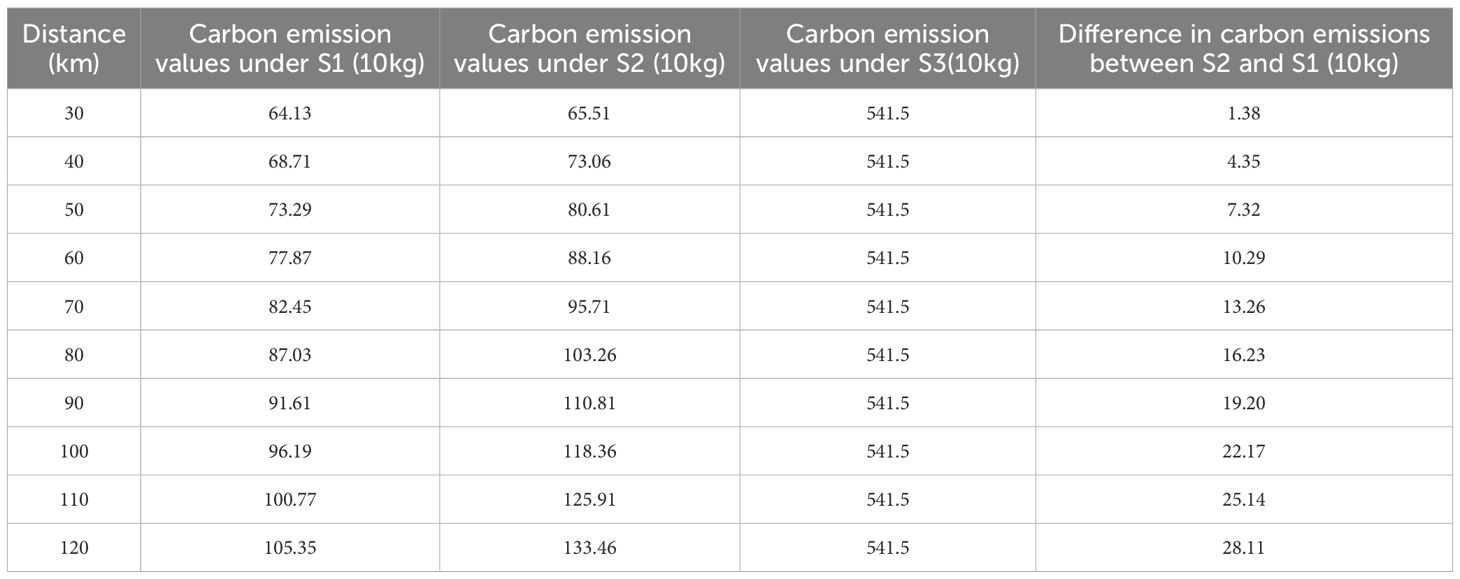 Table 4. Carbon emission comparison under different scenarios while distances between seaport and dry port vary.