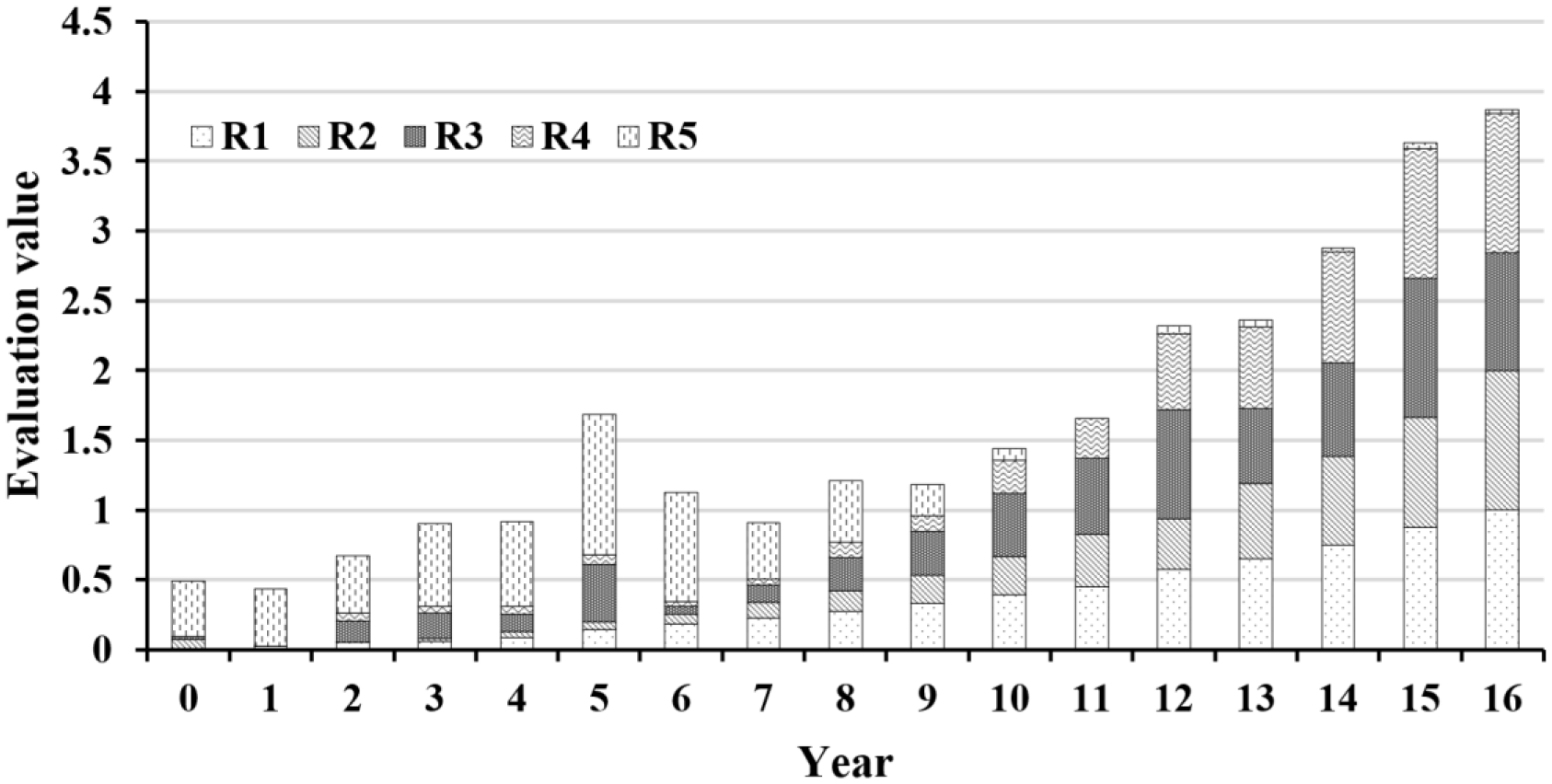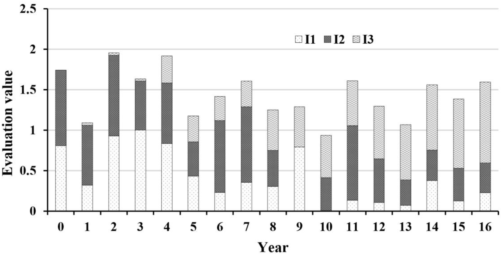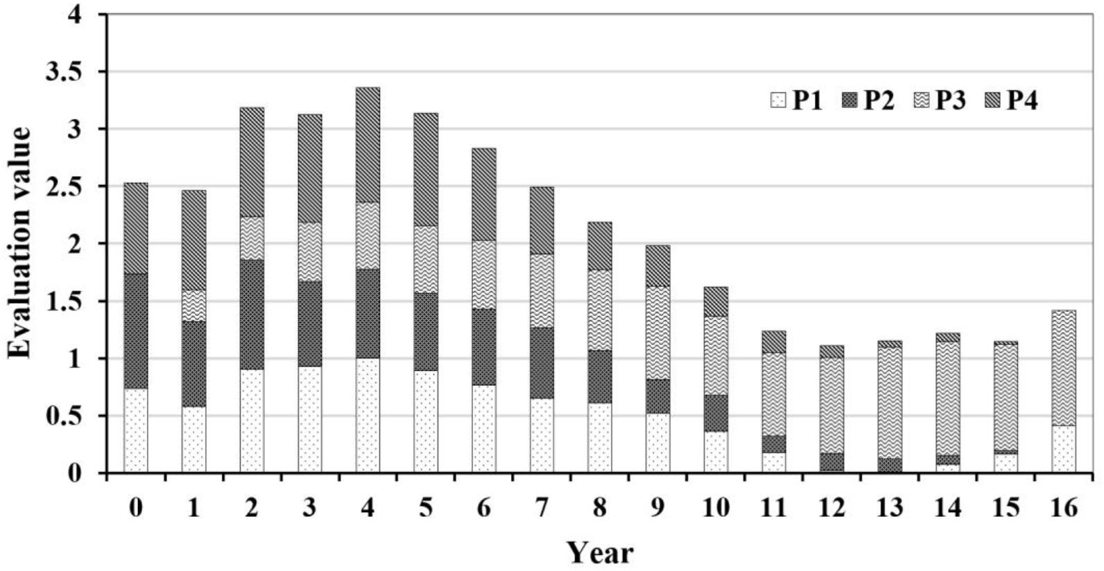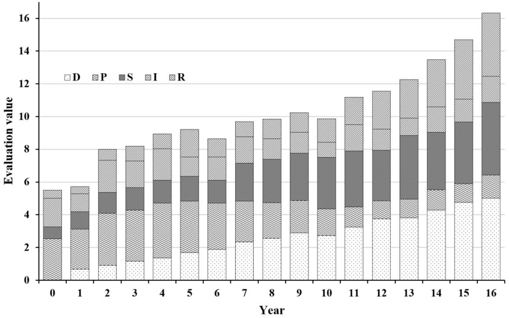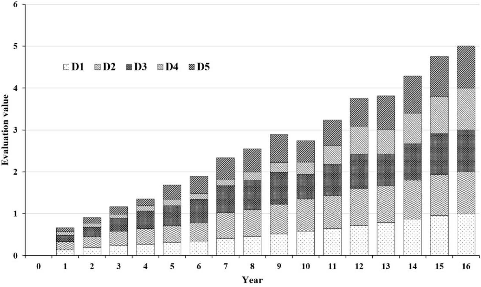 The retained dataset was analyzed by the DPSIR framework, which categorizes indicators into five groups: D (driving force), P (pressure), S (state), I (impact) and R (response). Each indicator was re-numbered for clarity. Using 2010 as the reference year (year 0), subsequent years were renumbered sequentially. The entropy weight method was then applied to determine the weight of each indicator, with the results presented in Table 1.