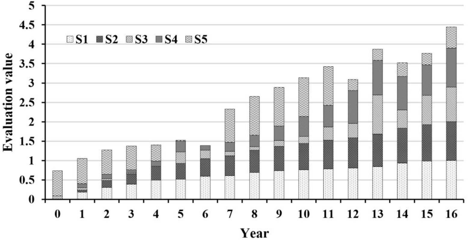 These trends indicate that China has moved beyond the initial phase of ocean exploration and now possesses a substantially stronger capacity for advanced marine research. According to the CDGM(1, 1) model predictions, by 2026, the output value of the marine scientific research, education, management and service industry will reach CNY 49,551 trillion, while patent applications from marine research institutions will total 10,840. With robust financial and technical resources, the nation is positioned to deepen its understanding of the marine environment, thereby facilitating the construction of more sustainable ocean development framework. The contribution value of the response subsystem to sustainable utilization is shown in Figure 13.