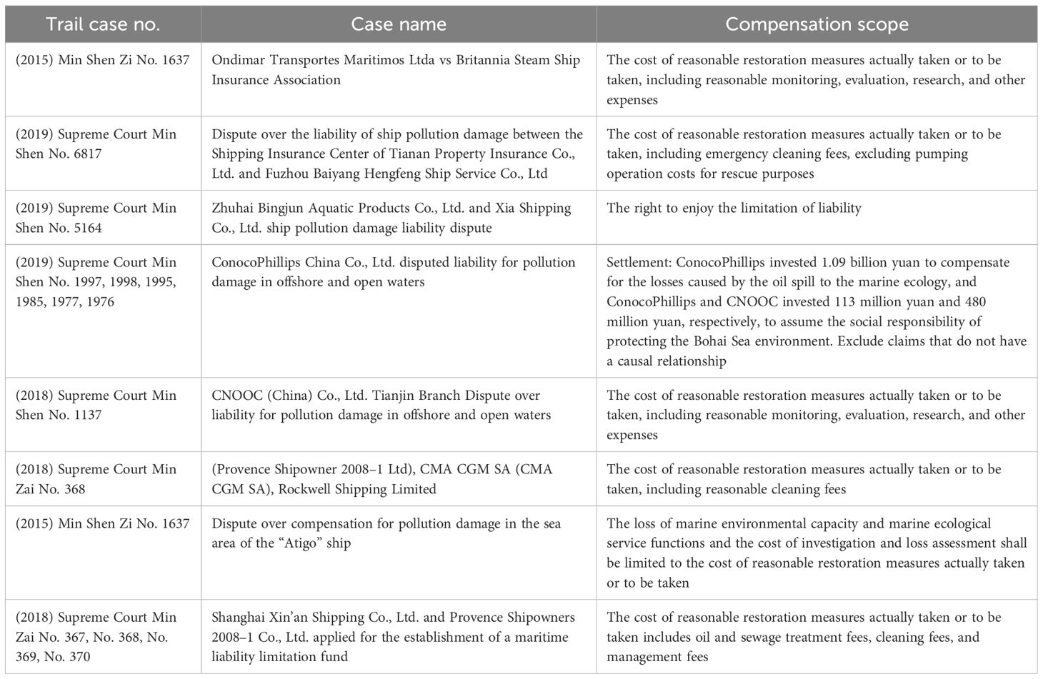 As for jurisdictional practice, according to the analysis of China’s Supreme People’s Court precedents related to environmental damage caused by oil pollution consulted by Law Wkinfo database (Table 1), the compensation for environmental damage is usually limited to the cost of reasonable restoration measures actually taken or to be taken.