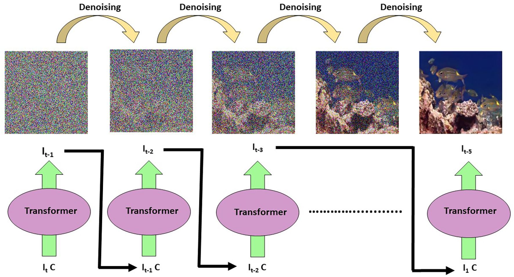 Where represents the denoised image at step t, signifies the transformer network, function represents the feature extraction and processing steps before feeding the data to the transformer network, noisy image at step t, represents clean or partially denoised image, represents time step information.