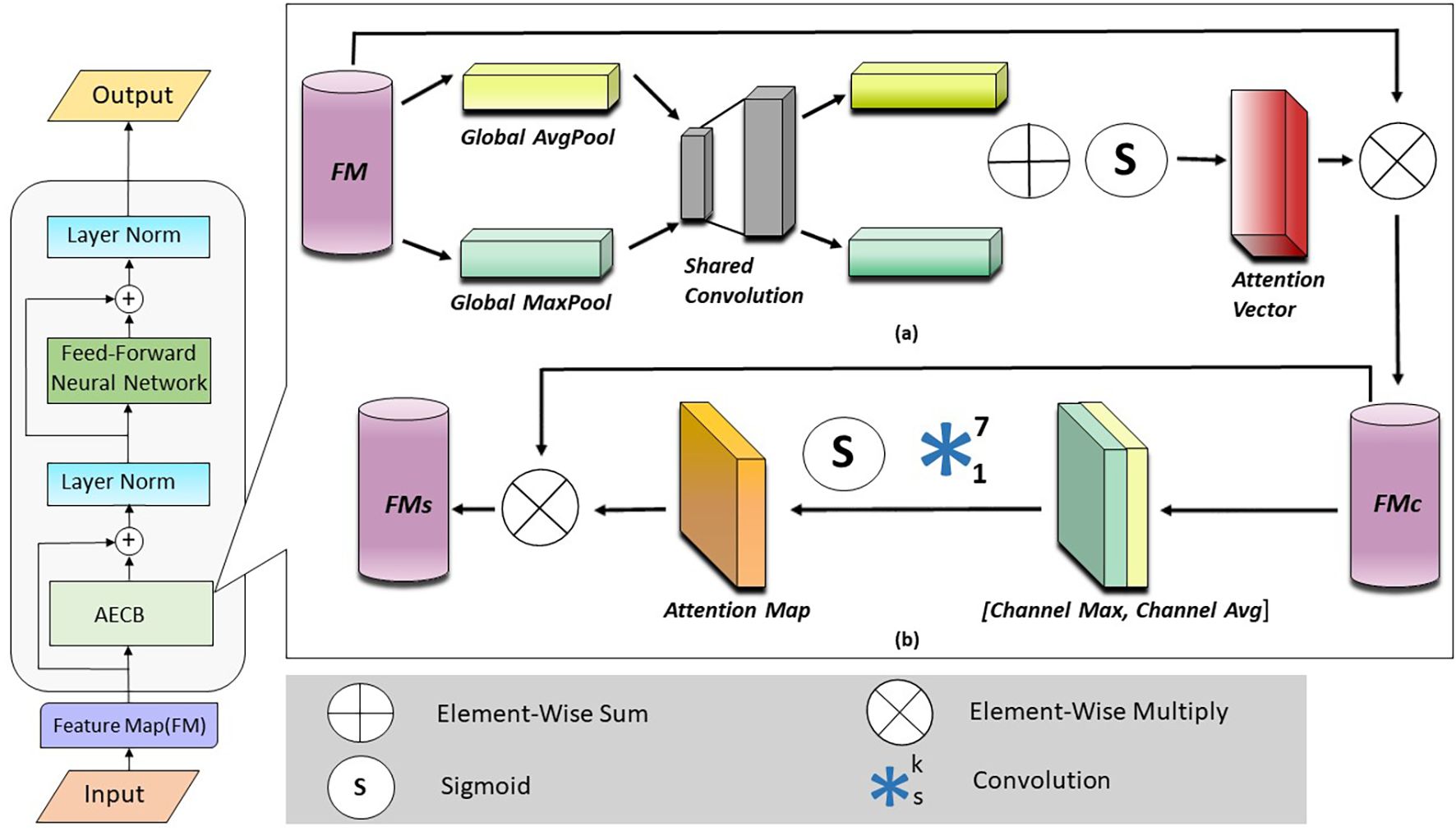 Let FM denote the feature map resulting from the above operation. The output achieved from the normalization block is fed to the convolution block attention module. The Attention-Enhanced Convolutional Block (AECB), is used to improve feature representation in convolutional neural networks (CNNs). It consumes an input feature map (FM) and produces an improved output (FMs) by integrating two attention mechanisms: channel attention (Mc) and spatial attention (Ms).