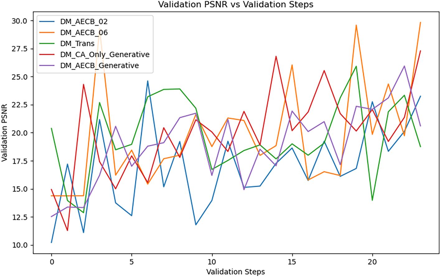 DM-AECB consistently delivers significantly higher PSNR values across all validation steps as training progresses. This marked performance differential underscores the model’s exceptional capability to preserve image quality while effectively mitigating noise. In contrast, DM-AECB Large, while yielding commendable results, slightly underperforms compared to DM-AECB. The performance gap between these top-tier models and the remaining variants, including DM Trans and generative models, is substantial, highlighting the efficacy of the DM-AECB architecture in optimizing image restoration.