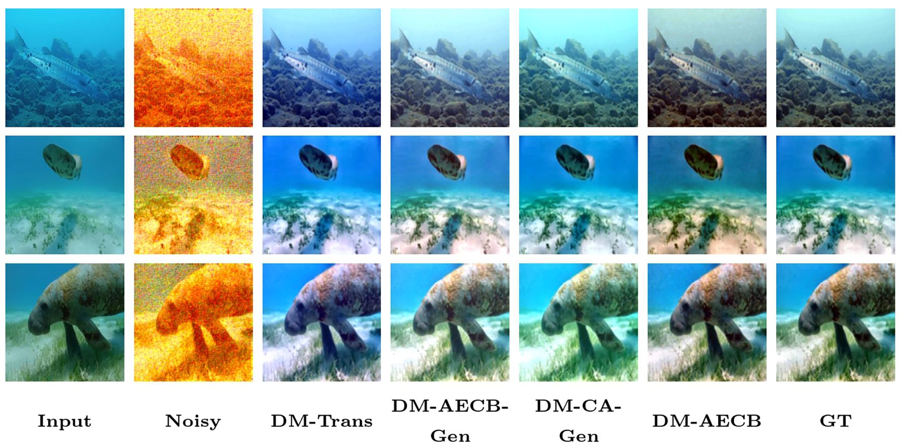 Visual analysis of underwater image enhancement results in Figure 7 indicates that DM-AECB consistently generates the most natural and visually appealing images. This variant effectively restores colors, preserves fine details, and minimizes artifacts across various underwater scenes. Although DM-AECB-Gen shows potential in color correction, it introduces more artifacts and less natural appearance compared to DM-AECB. DM-Trans improves visibility but often causes color distortions and blurriness. DM-CA-Gen struggles with both color correction and detail preservation, resulting in less pleasing outputs. Generative variants (DM-AECB-Gen and DM-CA-Gen) suffer from color distortion but are noted for robustness to noisy inputs, as visible in column 01. Further quantitative evaluation using metrics such as PSNR and SSIM could provide additional insights into their comparative performance.