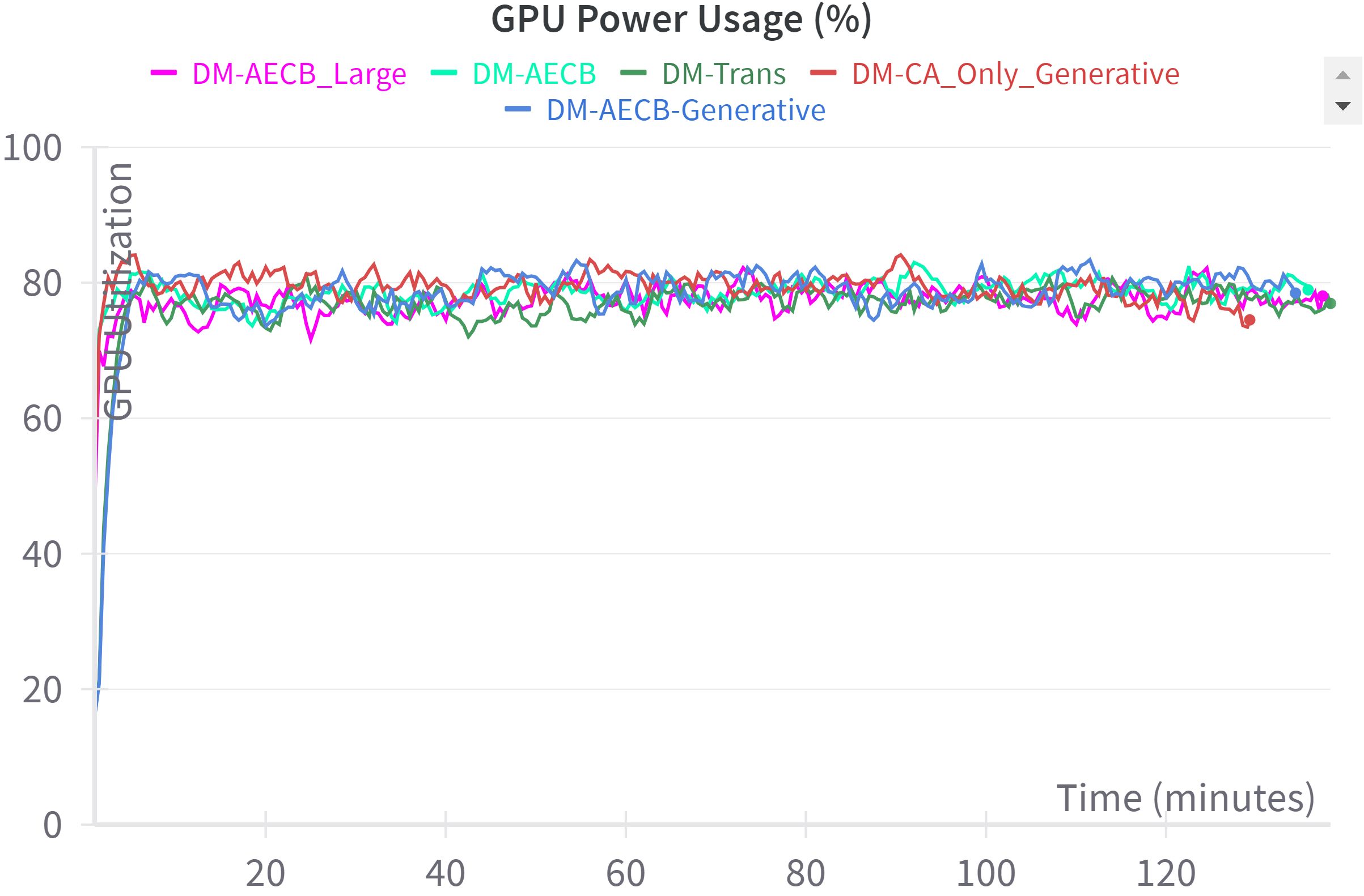 GPU power consumption analysis from Figure 8 reveals that DM-AECB is the most energy-efficient model, rapidly stabilizing at a low power level without requiring additional GPU resources compared to DM-Trans. DM-AECB Large also demonstrates controlled power usage but consumes slightly more energy. DM-Trans exhibits fluctuating power consumption, and both generative models show significantly higher energy demands. These findings underscore DM-AECB’s efficacy for cost-effective and environmentally friendly deployment.
