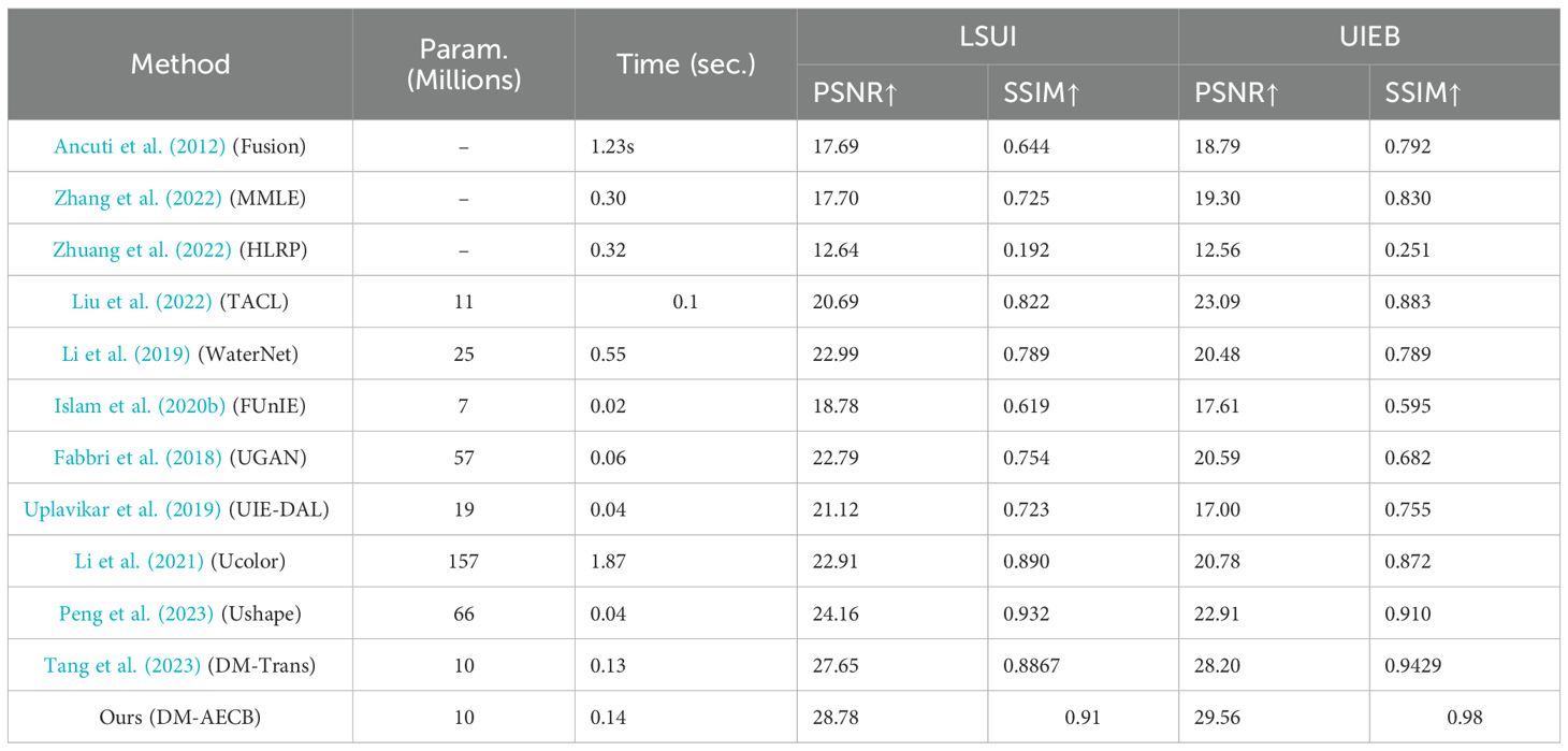 Table 1. Comparison of PSNR and SSIM values for different underwater image enhancement methods on the LSUI and UIEB datasets.