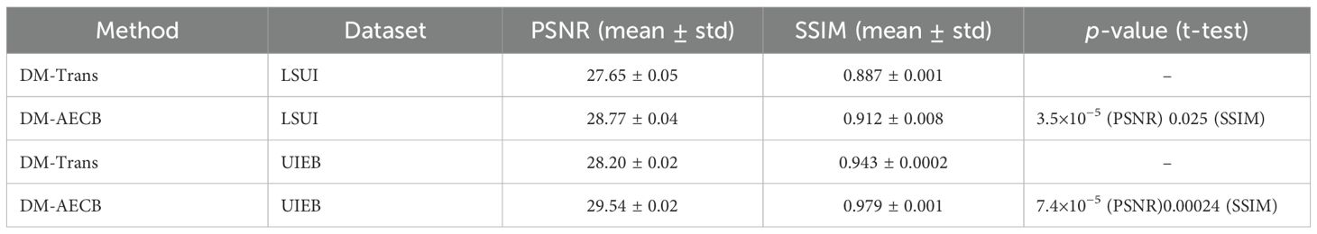 To validate the robustness of our findings, we report the mean and standard deviation of PSNR and SSIM (across three trials) for all methods. Additionally, paired t-tests were performed between the proposed DM-AECB and the strongest baseline, DM-Trans, on both benchmarks.