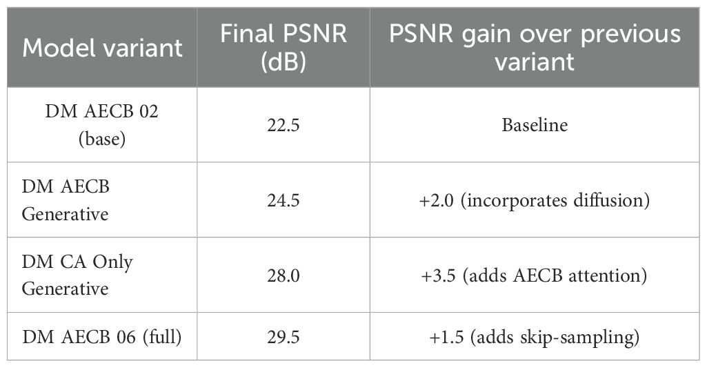 Table 3 quantitatively summarizes the individual contributions of key components within the DM-AECB architecture by reporting the final average PSNR values for different model variants.
