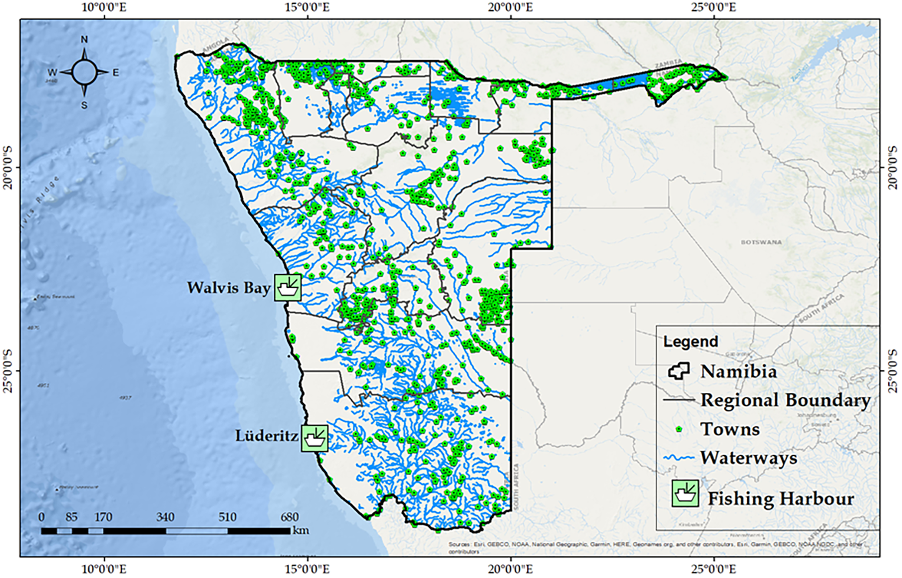 Namibia’s Exclusive Economic Zone lies within the BCLME, a highly productive ecosystem, characterized by wind-driven coastal upwelling that supports high primary production and commercially valuable fish stocks (Gallego et al., 2025; Sowman and Cardoso, 2010). The country’s 1,572 km coastline stretches along the hyper-arid Namib Desert and the South Atlantic Ocean. The country has two ports, Walvis Bay and Lüderitz, where all fishing vessels dock (Figure 1). The country is located in the southwest of Africa, bordered by South Africa, Botswana, Zambia, Zimbabwe, and Angola. The country has an area of 824, 296 square kilometers with a population of about 3 million people (Namibia Statistics Agency, 2023). The combination of the desert and typography of the Namibian coastline such as the inhospitable arid land between the desert and the sea has limited coastal settlement (Manning, 1998).