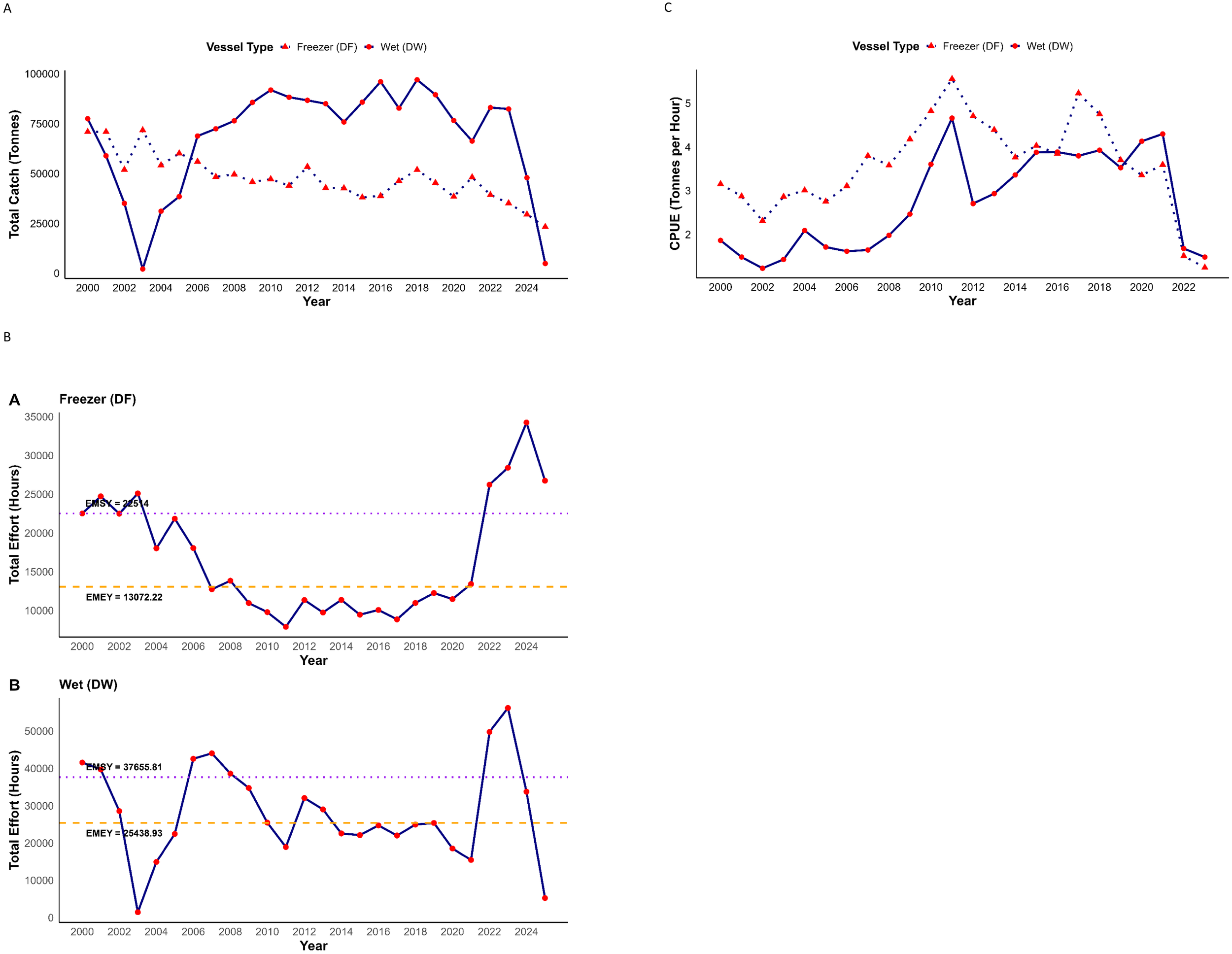 Total catch fluctuated considerably across the study period. The catch of the wet-fish trawlers (DW) decreased from 2000, reaching a low of 2,074 tonnes in 2003, before steadily increasing to a peak of 91,862 tonnes in 2010 (Figure 2A). Their catches fluctuated from 2014 to 2022 followed by a sharp decline to 47,937 tonnes in 2024. In contrast, the catches of freezer trawlers showed a consistent downward trend, declining from a peak of 71,759 tonnes in 2003, to a low of 29,526 tonnes in 2024. The decline of the catches from 2000 to 2003 especially by the DW trawlers could reflect TAC reductions and management programs introduced during this period, followed by a sharp increase as quotas were relaxed.