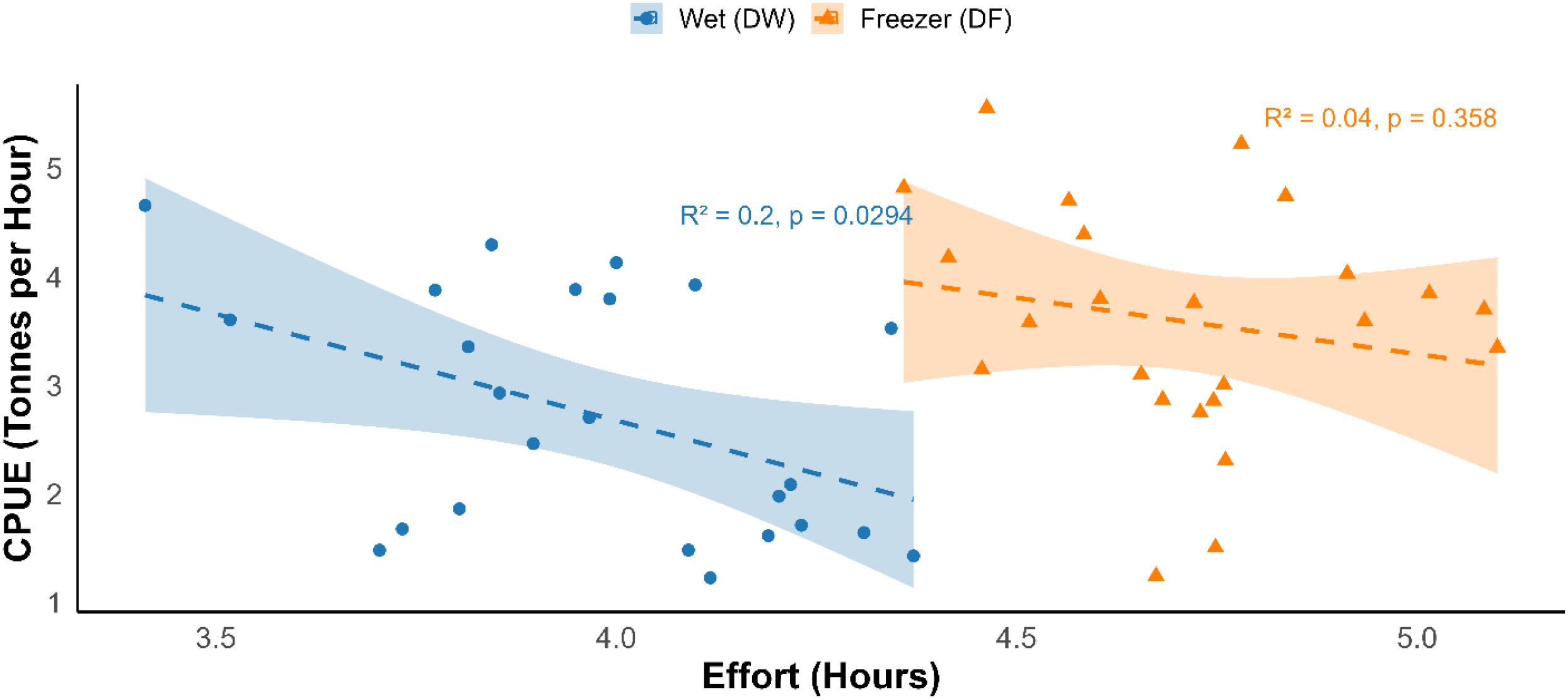 A regression plot showing the relationship between fishing effort (hours) and catch per unit effort (CPUE, in tonnes per hour) in Namibia’s hake fishery between year 2000 and 2024. The blue dashed line represents fitted linear regression for the wet-fish trawlers (DW) while the orange dashed line represent the one for the freezer trawlers. The shaded region shows 95% confidence interval.