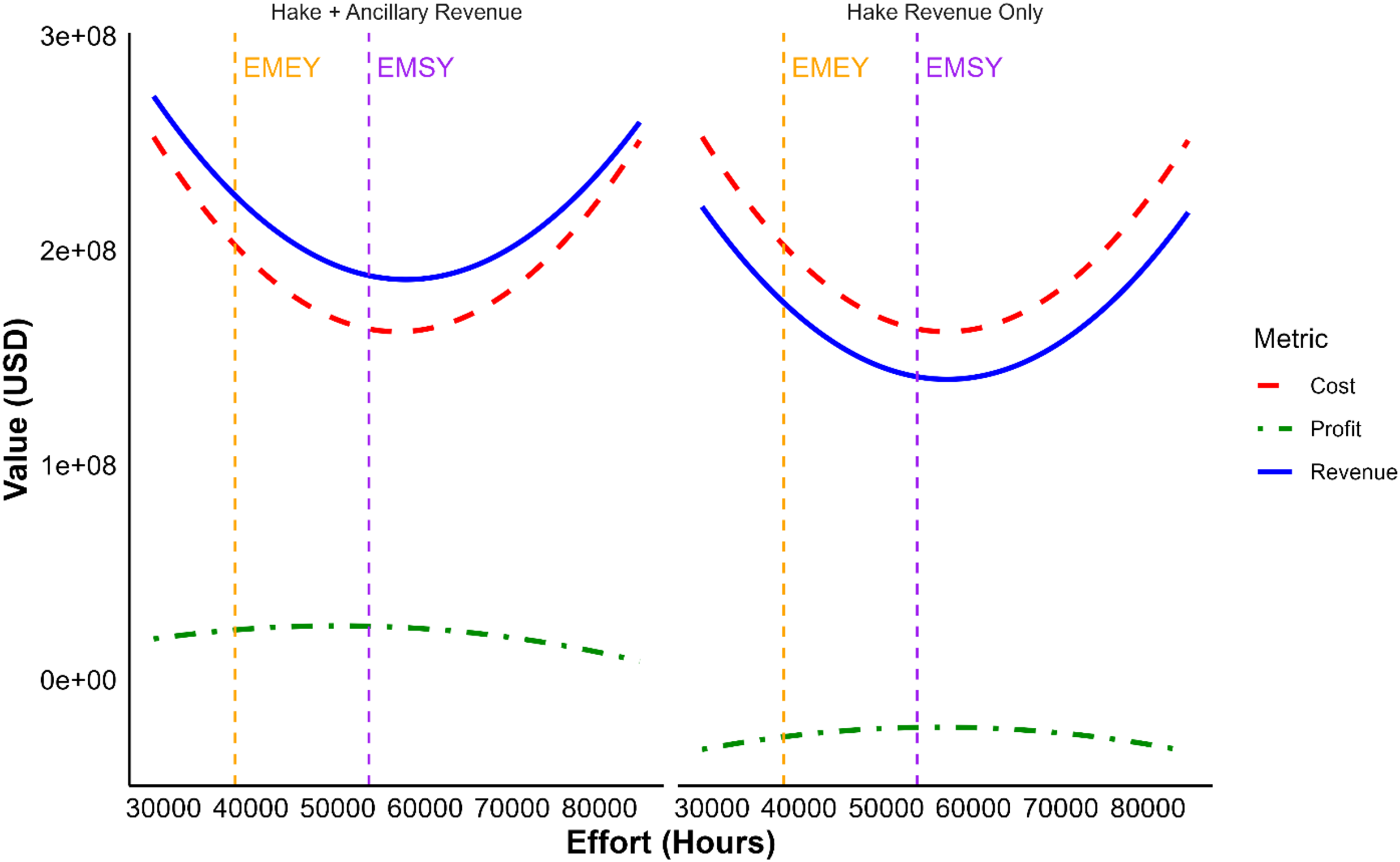 In the hake-only scenario, the fishery operated at a net loss during the period examined, with maximum profit recorded at –N$186.9 million (≈–USD 12.9 million), despite effort reaching 37,650 hours (Figure 4). In contrast, the hake + ancillary income scenario yielded a positive maximum profit of N$532.5 million (≈USD 36.7 million) at the same effort level. Maximum catch were recorded at approximately 35,937 hours of effort in both scenarios, which fell below the overall EMSY (53, 534 hour).