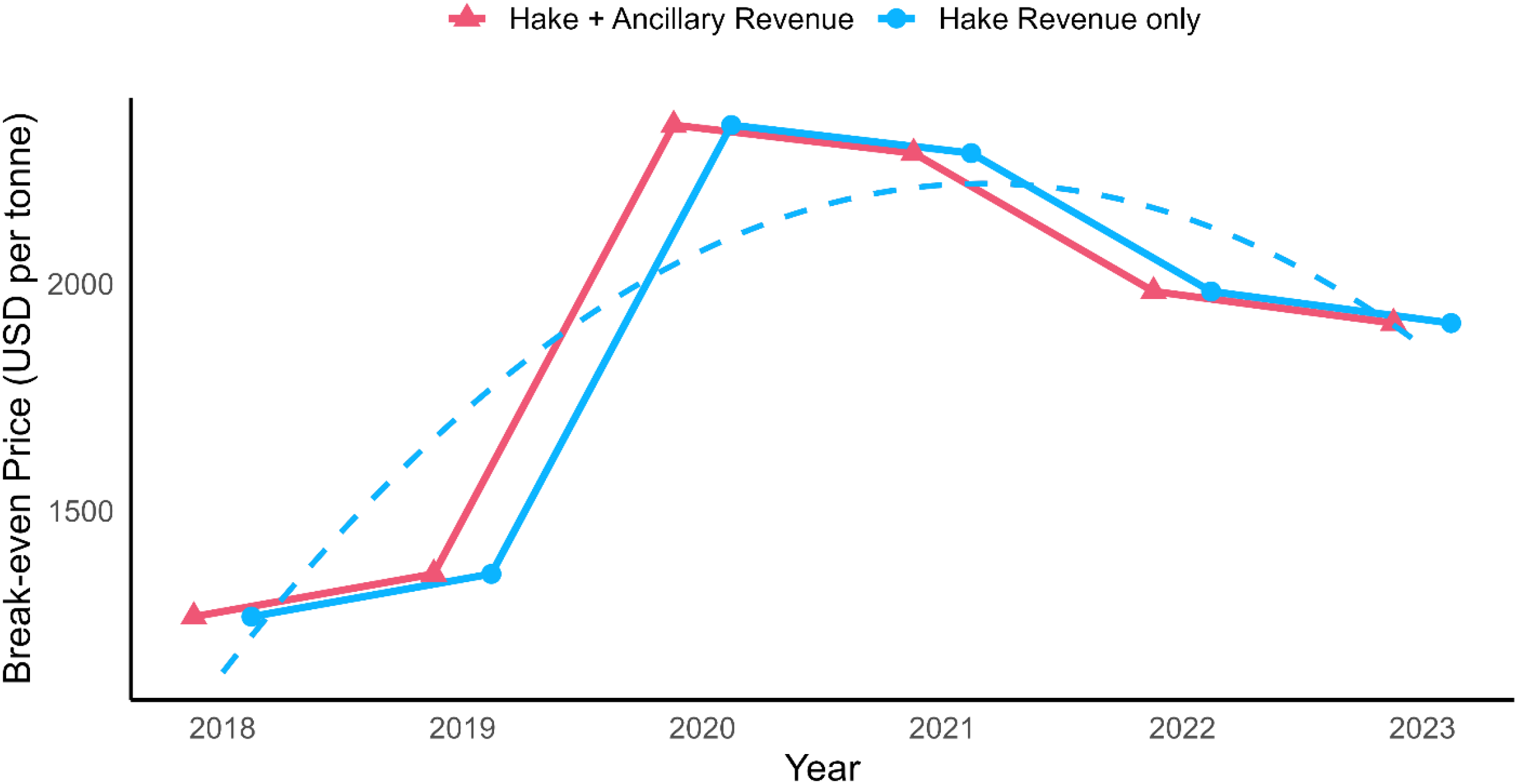 Breakeven price per tonne of hake in USD for the years 2018–2023, based on operational costs and catch volumes from Namibian hake fisheries. The solid blue line represents the annual break-even price trend, while the dashed red line shows a fitted second-degree polynomial trend. The increase in break-even price over time highlights rising costs or reduced catch, reinforcing economic vulnerability in the absence of supplementary income sources such as by-catch or quota fees.