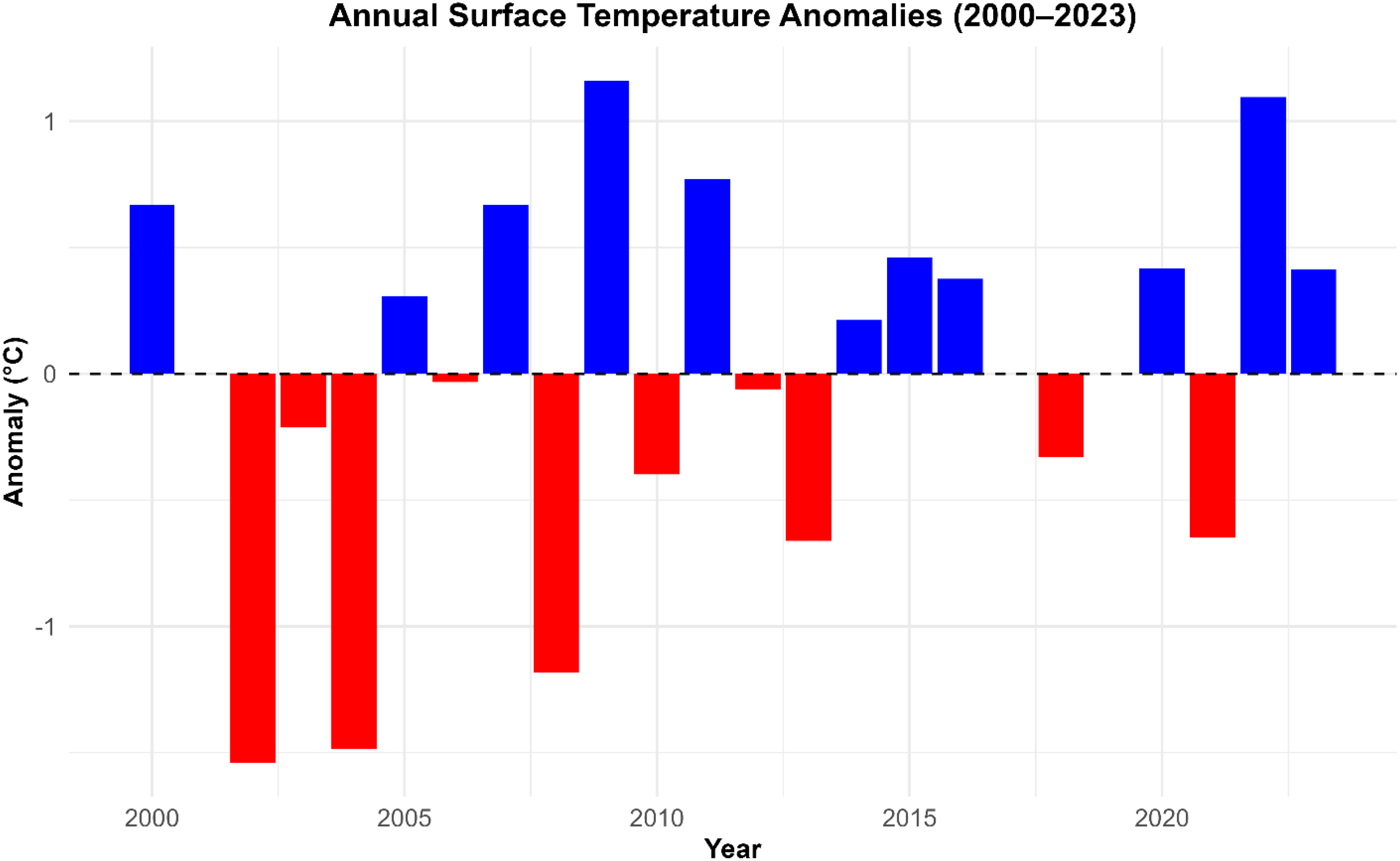 To further contextualize these temperature shifts, we calculated the anomalies of annual sea surface temperature anomalies by comparing each year’s mean SST to the long-term (2000–2023) average. As shown in Figure 6, anomalies ranged from –1.54°C to +1.2°C, illustrating pronounced departures from the climatological baseline.
