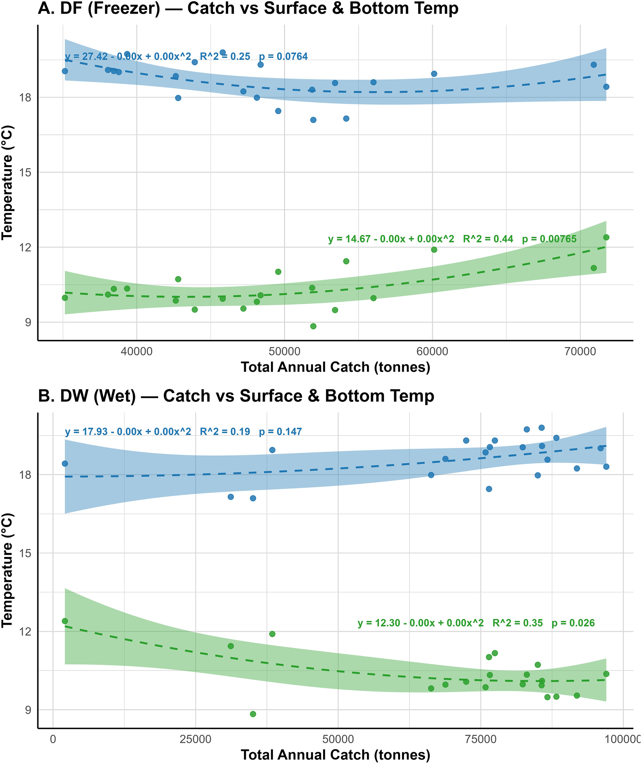A relationship between the annual catches (tonnes) of Hake fishery and average annual surface and bottom temperatures from 2000 to 2023 for freezer (DF; A) and wet-fish (DW; B) trawlers. The dashed blue lines represent fitted quadratic regression models for surface temperature, while the dashed green lines represent that for bottom temperature. The shaped areas show the 95% confidence intervals. The R2 presented in each model shows the magnitude or proportion of variance in the CPUE that was explained by changes in the surface and bottom temperature.