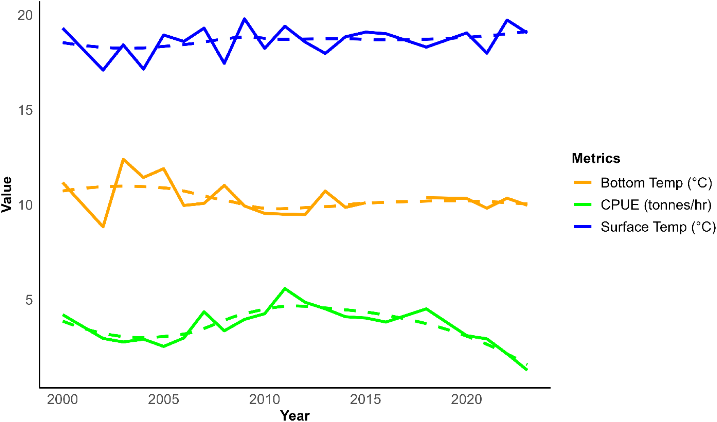 The annual trends of catch per unit effort (CPUE, tonnes/hour), the sea surface temperature and bottom temperature for Hake fishery between 2000 and 2023 in Nambian waters. The dashed lines show LOESS-smoothed trends, and the solid lines represent the observed values.