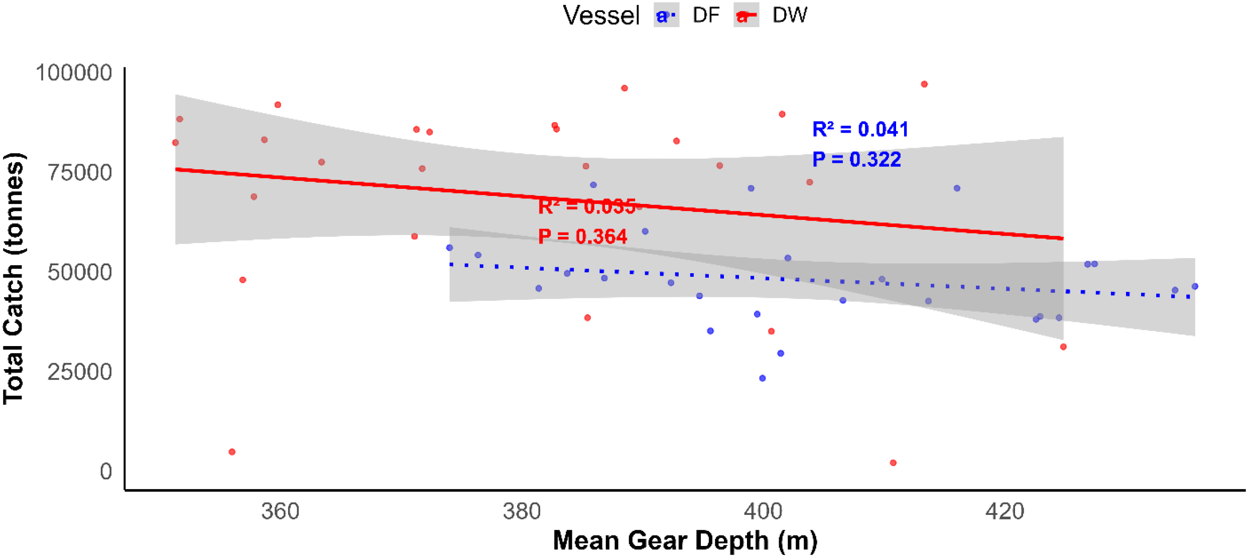 We assessed the relationship between CPUE and fishing effort across the two vessel types (Figure 3). In the DW dataset, we observed a significant negative relationship between fishing effort and CPUE (R2 = 0.2, p = 0.029), indicating that higher fishing effort was associated with lower CPUE. A similar trend was also observed for DF trawlers; however, the relationship was weaker and statistically non-significant (R2 = 0.04, p = 0.358). Overall, the significant decline of CPUE with increasing effort observed in DW trawlers, but not in DF trawlers indicates contrasting responses in catch efficiency between the two vessel types, possibly reflecting differences in the fishing strategies or sensitivity to stock abundance under varying fishing pressure. In addition, the sharp decline in efforts and catch in recent years likely reflects a combination of factors such as reduced stock productivity, lower catchability under unfavourable environmental conditions, and economic pressures on the fishing vessels.