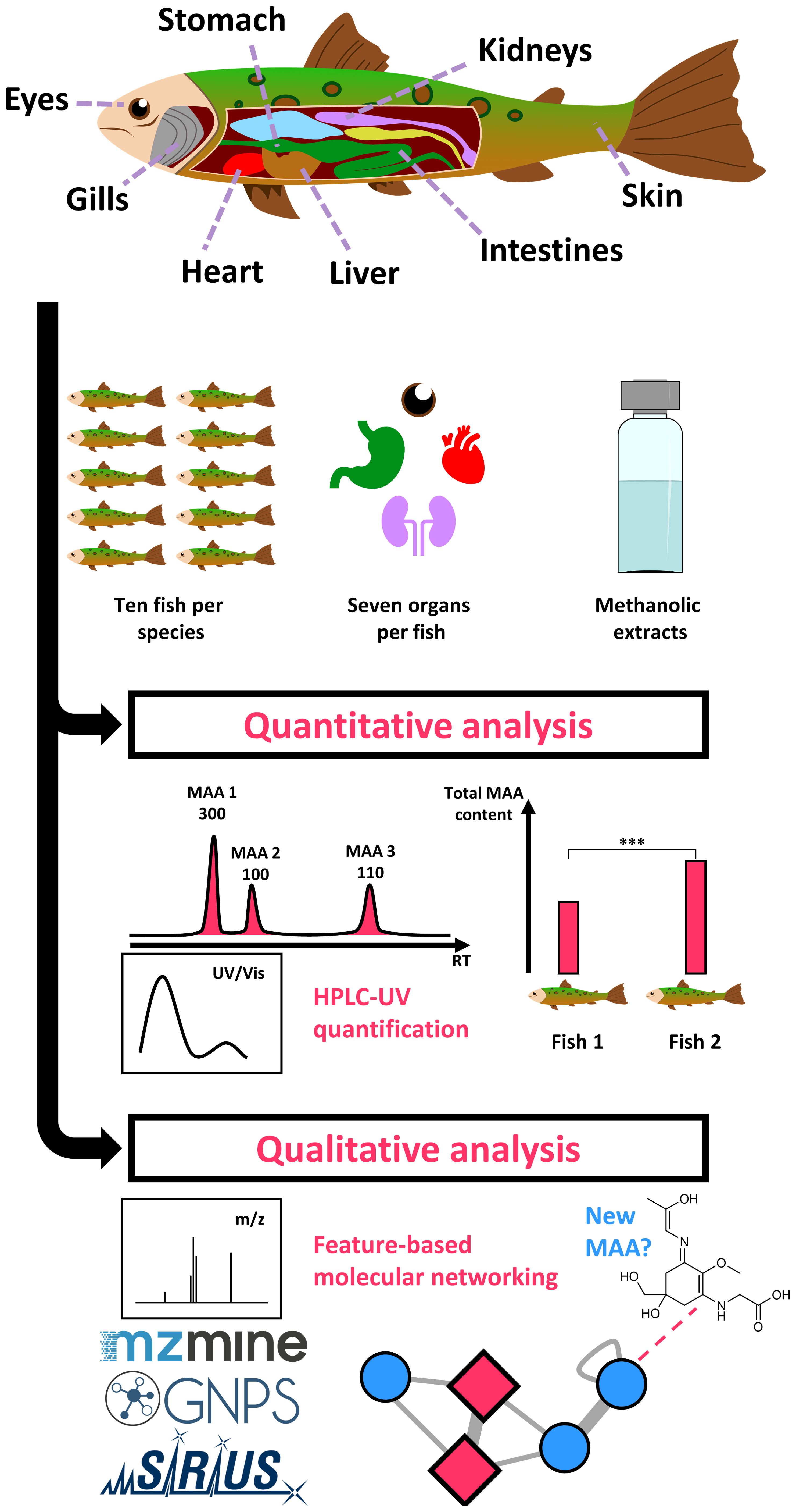 Figure 1. Study workflow: Fish were dissected and methanolic extracts prepared from eight different fish organs (i.e., left and right eyes, gills, heart, intestine, kidneys, liver, skin, and stomach). MAA concentrations were quantified based on HPLC-UV analyses. Additionally, untargeted metabolomics using UHPLC-HRMS/MS followed by feature-based molecular networking enabled qualitative analysis of the samples.